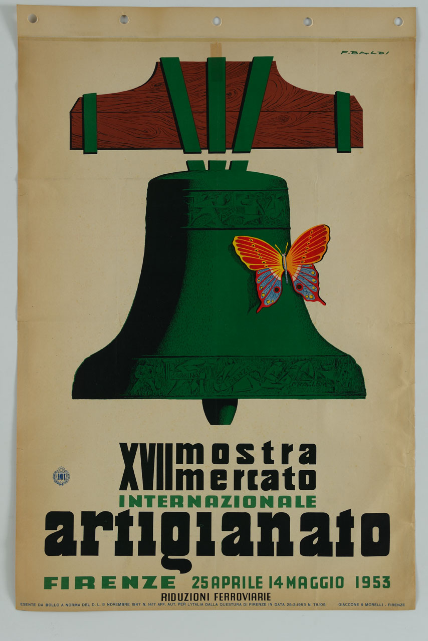 Lettura iconografica: campana; farfalla. Categoria merceologica/ tipo evento: artigianato; mostre mercato; enti di promozione turistica; riduzioni ferroviarie. Nomi: XVII Mostra mercato internazionale artigianato; ENIT; Ente Nazionale per l'incremento delle Industrie Turistiche. Luoghi: Firenze