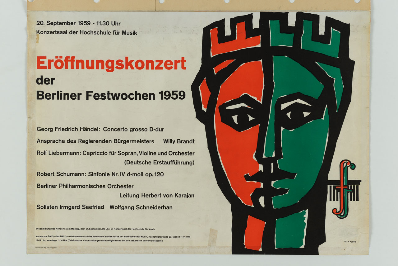 Lettura iconografica: figura femminile; corona; mura turrite. Categoria merceologica/ tipo evento: spettacolo; teatro; musica; concerto. Nomi: Hochschule für Musik; Berliner Festwochen 1959; Georg Friedrich Händel; Willy Brandt; Rolf Liebermann; Robert Schumann; Berliner Philharmonisches Orchester; Herbert von Karajan; Irmgard Seefried; Wolfgang Schneiderhan. Luoghi: Germania; Berlino; Berlin