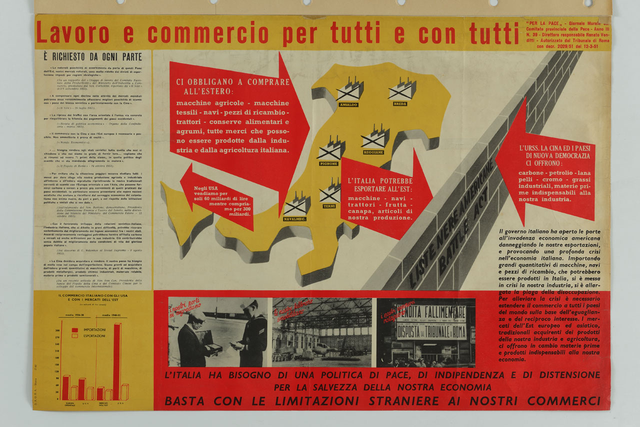 Lettura iconografica: riproduzioni fotografiche; figure maschili; marinaio; stabilimento industriale; cartelli. Categoria merceologica/ tipo evento: informazione e comunicazione; editoria; periodico; giornale murale; associazioni sociali. Nomi: Per la Pace; Comitato provinciale della Pace; Renato Venditti; URSS; USA; Navalmeccanica; Terni; Pignone; Officine Meccaniche Reggiane; Breda; Ansaldo. Luoghi: Roma