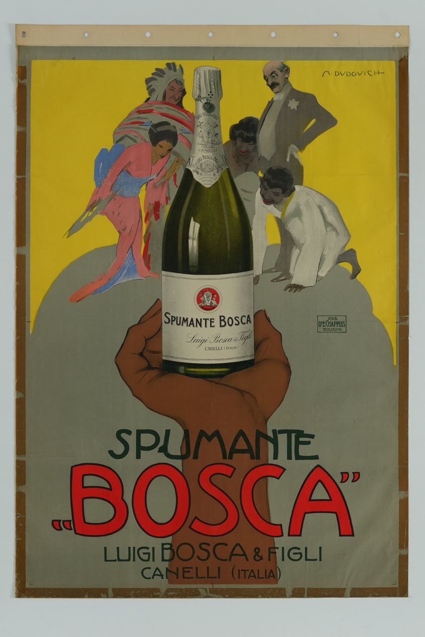 Lettura iconografica: figure maschili; figure femminili; capo indiano; kimono; mano; bottiglia di spumante. Categoria merceologica/ tipo evento: industria alimentare; bevande; vino spumante. Nomi: Spumante Bosca; Luigi Bosca & Figli. Luoghi: Asti; Canelli