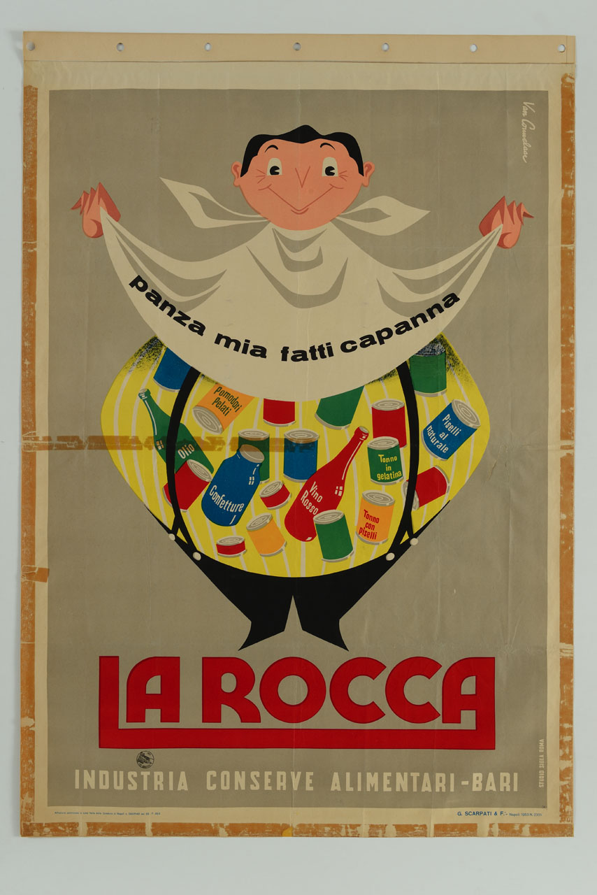 Lettura iconografica: figura maschile; tovagliolo; bottiglie; barattoli. Categoria merceologica/ tipo evento: industria alimentare; prodotti a base di pesce; tonno in scatola; conserve a base di ortaggi; pomodoro pelato; piselli; conserve a base di frutta; confettura; olio; bevande; vino. Nomi: La Rocca. Luoghi: Bari