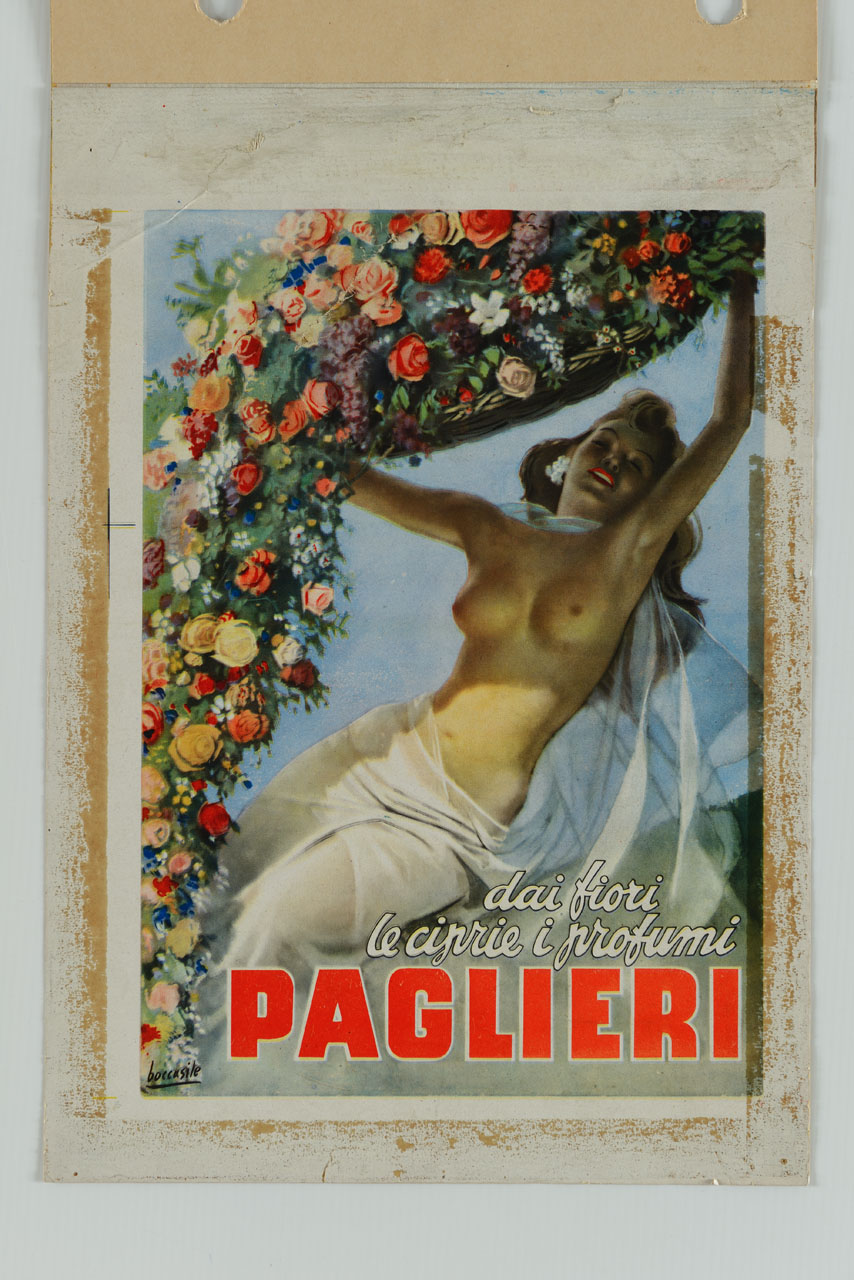 Lettura iconografica: figura femminile; orecchino; velo; cesto; fiori; rose; foglie; composizione floreale. Categoria merceologica/ tipo evento: industria chimica; cosmetici; cipria; profumi. Nomi: Paglieri