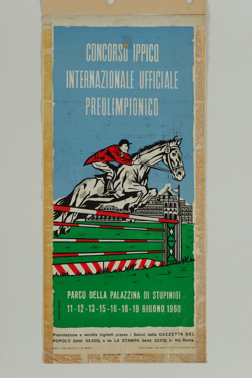Lettura iconografica: cavallo; figura maschile; fantino; ostacolo; prato; edificio. Categoria merceologica/ tipo evento: sport; ippica; concorso; enti di promozione turistica; informazione e comunicazione; editoria; quotidiano. Nomi: Concorso ippico internazionale ufficiale preolimpionico; Parco della Palazzina; Gazzetta del Popolo; La Stampa; EPT; Ente Provinciale del Turismo. Luoghi: Torino; Nichelino; Stupinigi