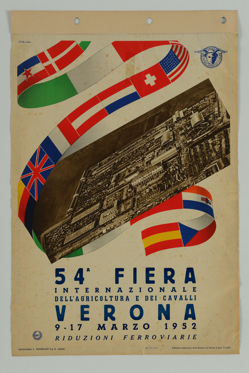 Lettura iconografica: veduta di città; ippodromo; bandiere. Categoria merceologica/ tipo evento: commercio; mostre mercato; agricoltura; allevamenti; fiere; trasporti; trasporto terrestre; riduzioni ferroviarie. Nomi: Fiera internazionale dell'agricoltura e dei cavalli; ENIT; Ente Nazionale per l’incremento delle Industrie Turistiche; Union des Foires Internationales. Luoghi: Verona