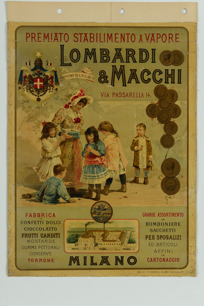 Lettura iconografica: figure femminili; figure maschili; bambini; confezione dolciumi; veduta con architettura; stabilimento dolciario; medaglie. Categoria merceologica/ tipo evento: industria alimentare; conserve a base di frutta; mostarda; cioccolato; dolciumi al cioccolato; dolciumi; confetti; frutta candita; gomme pettorali; torrone; industria della carta; imballaggi; bomboniera; sacchetto. Nomi: Stabilimento Lombardi & Macchi. Luoghi: Milano