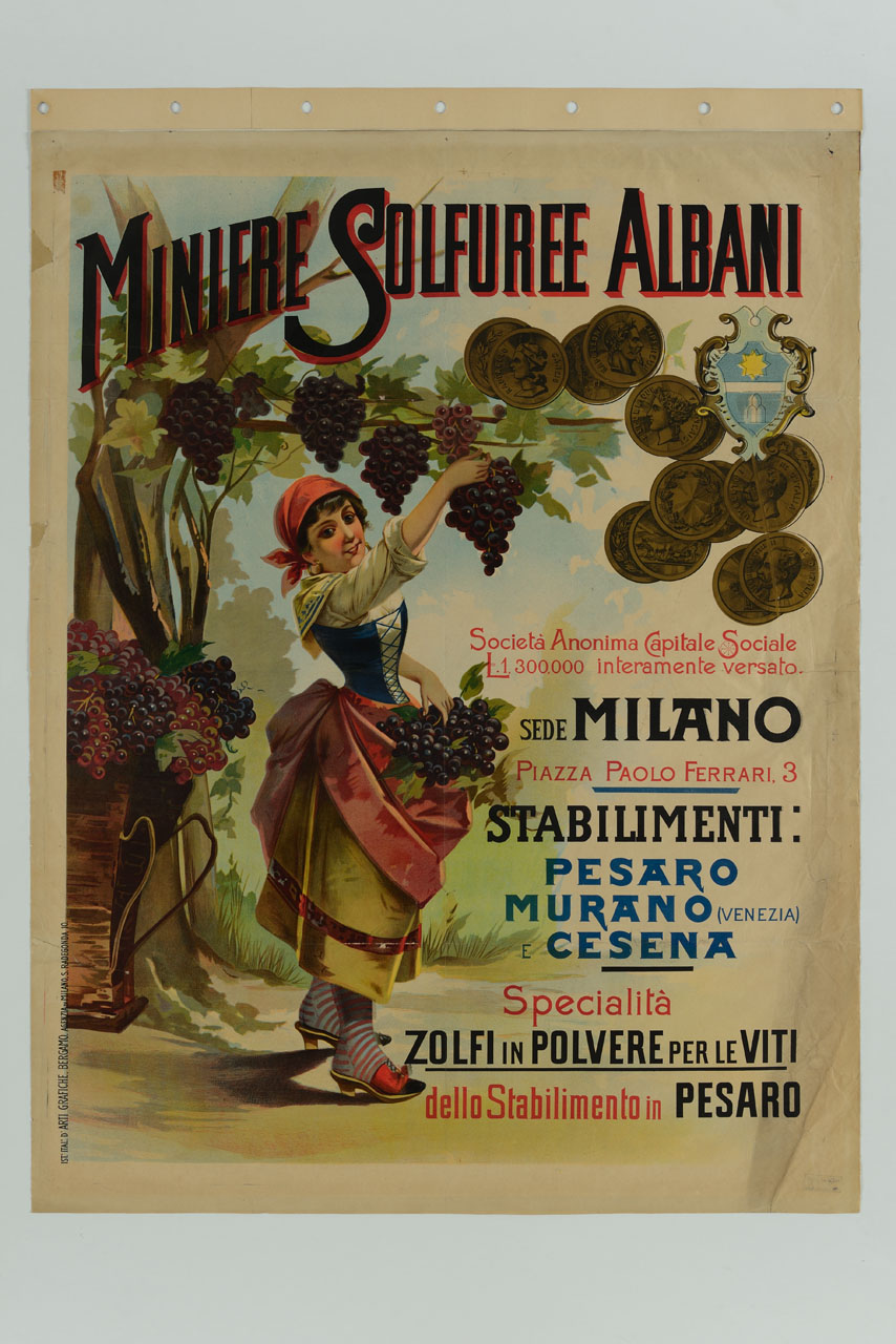 Lettura iconografica: ragazza; fazzoletto rosso; grembiule rosso; bustino blu; camicia bianca; gonna gialla; scialle giallo; zoccoli rossi; vite; tralci; grappoli d’uva; medaglie d’oro; stemma. Categoria merceologica/ tipo evento: industria mineraria ed estrattiva; estrazione di zolfo; agricoltura; frutta; uva; industria chimica; prodotti chimici per l'agricoltura; disinfestante. Nomi: Miniere Solfuree Albani. Luoghi: Milano; Pesaro; Pesaro-Urbino; Murano; Venezia; Cesena; Forlì-Cesena