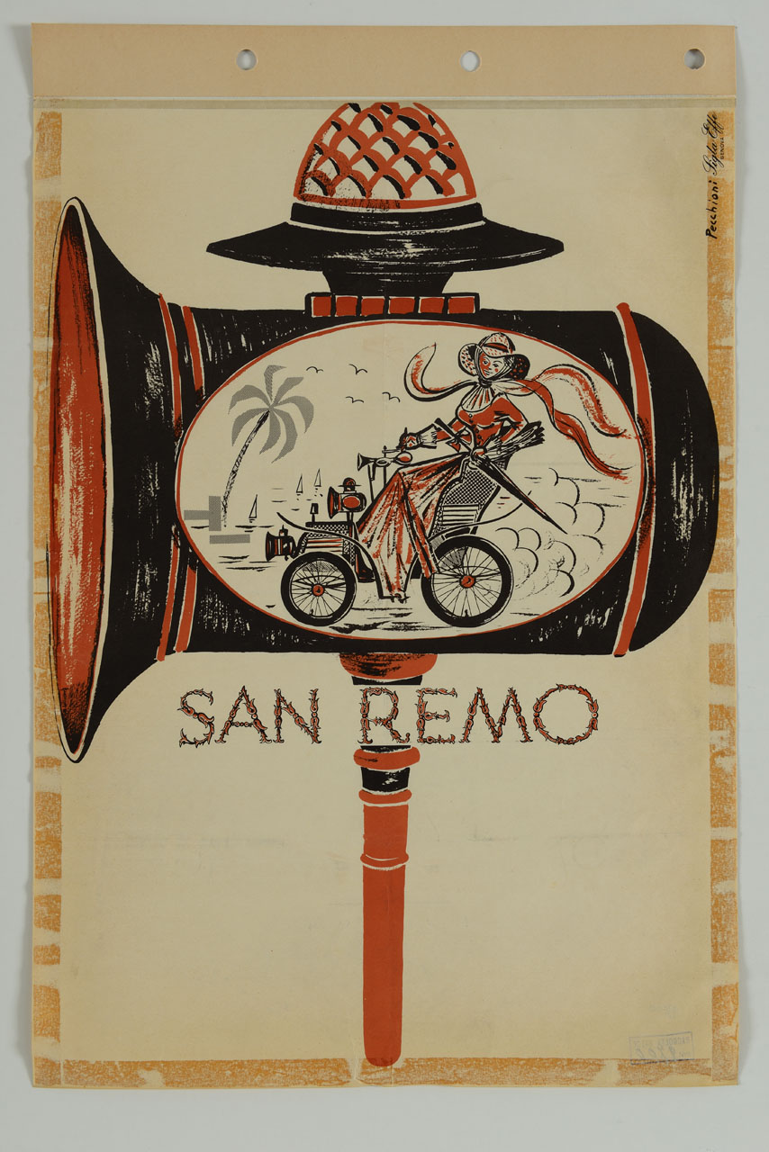 Lettura iconografica: clacson; figura femminile; cappello; foulard; ombrello; automobile; palma; mare; barche a vela; gabbiani. Categoria merceologica/ tipo evento: turismo. Luoghi: Imperia; Sanremo