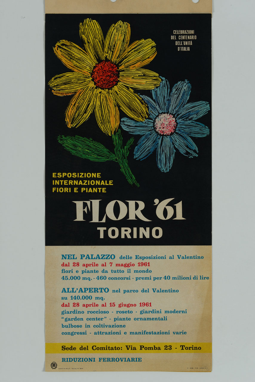 Lettura iconografica: margherita; stelo; foglia; fiore. Categoria merceologica/ tipo evento: floricoltura; esposizioni; manifestazioni culturali; celebrazioni; commemorazioni storiche; feste; riduzioni ferroviarie. Nomi: ENIT; Ente Nazionale per l'incremento dell'Industrie Turistiche; flor'61; celebrazioni del centenario dell'Unità d'Italia; esposizione internazionale fiori e piante; palazzo delle esposizioni; parco del Valentino. Luoghi: Torino