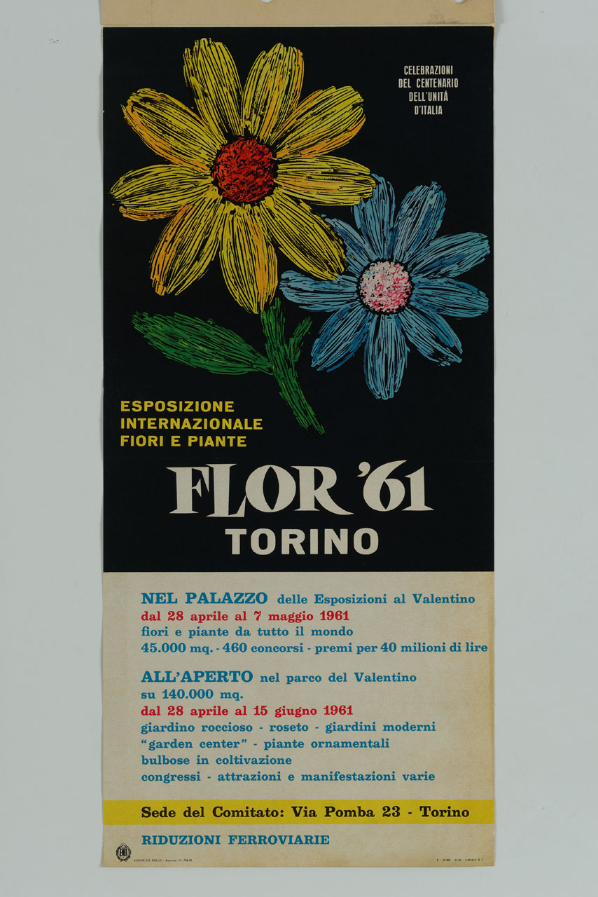 Lettura iconografica: margherita; stelo; foglia; fiore. Categoria merceologica/ tipo evento: floricoltura; esposizioni; manifestazioni culturali; celebrazioni; commemorazioni storiche; feste; riduzioni ferroviarie. riduzioni ferroviarie. Nomi: ENIT; Ente Nazionale per l'incremento dell'Industrie Turistiche; flor'61; celebrazioni del centenario dell'Unità d'Italia; esposizione internazionale fiori e piante; palazzo delle esposizioni; parco del Valentino. Luoghi: Torino