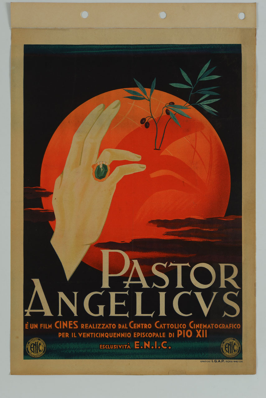 Lettura iconografica: sole; nuvola; mappamondo; ramoscello; ulivo; oliva; anello; anello piscatorio; pietra preziosa; smeraldo. Categoria merceologica/ tipo evento: cinema italiano; pastor angelicus. Nomi: pastor angelicus; Cines; Centro Cattolico Cinematografico; papa Pio XII; Pio XII; E.N.I.C.; Ente Nazionale Industrie Cinematografiche; Istituto nazionale Luce; Romolo Marcellini. Luoghi: Roma
