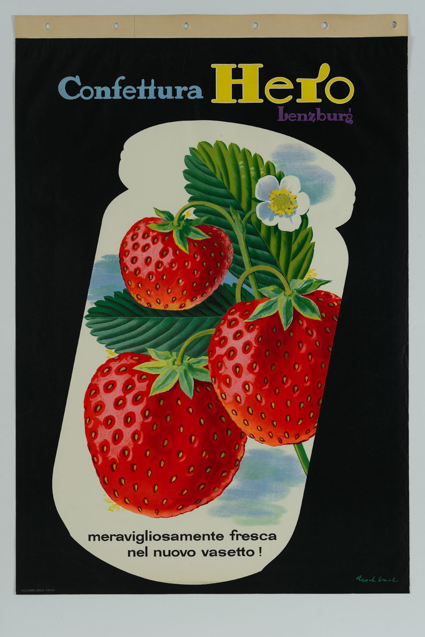 Lettura iconografica: vasetto per confettura; fragole; fiore. Categoria merceologica/ tipo evento: industria alimentare; conserve a base di frutta; confettura. Nomi: Hero; Gustav Henckell; Gustav Zeiler. Luoghi: Svizzera; Cantone Argovia; Lenzburg