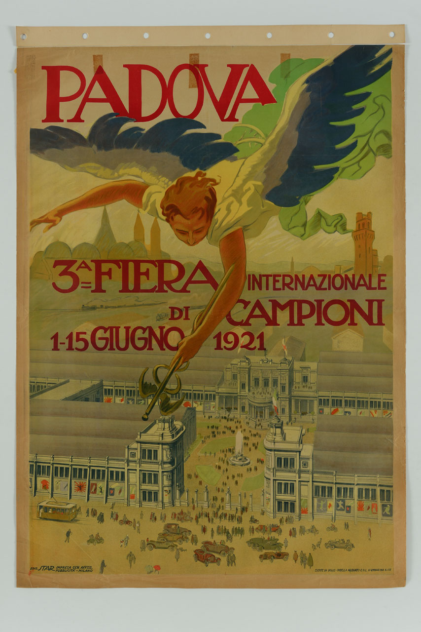 Lettura iconografica: figura alata; divinità; Mercurio; caduceo; veduta di città; veduta di Padova; architetture; torre; basilica; fiera; padiglioni; folla; automobili; tram. Categoria merceologica/ tipo evento: commercio; industria; artigianato; agricoltura; fiere. Nomi: 3 Fiera Internazionale di Campioni; Torre della Specola; Basilica di Sant'Antonio. Luoghi: Padova