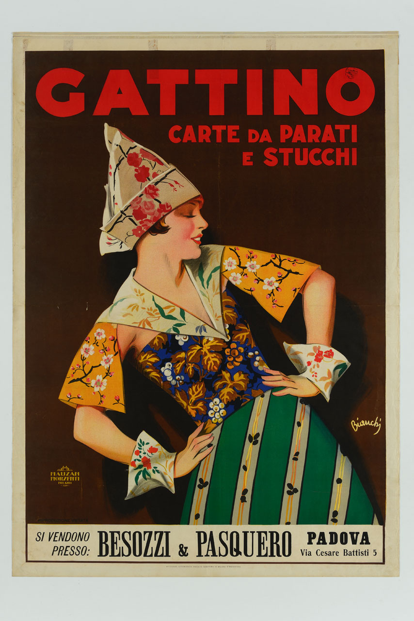 Lettura iconografica: figura femminile; vestito; cappello; carta da parati. Categoria merceologica/ tipo evento: industria della carte; carta da parati. Nomi: Gattino; Besozzi & Pasquero. Luoghi: Padova
