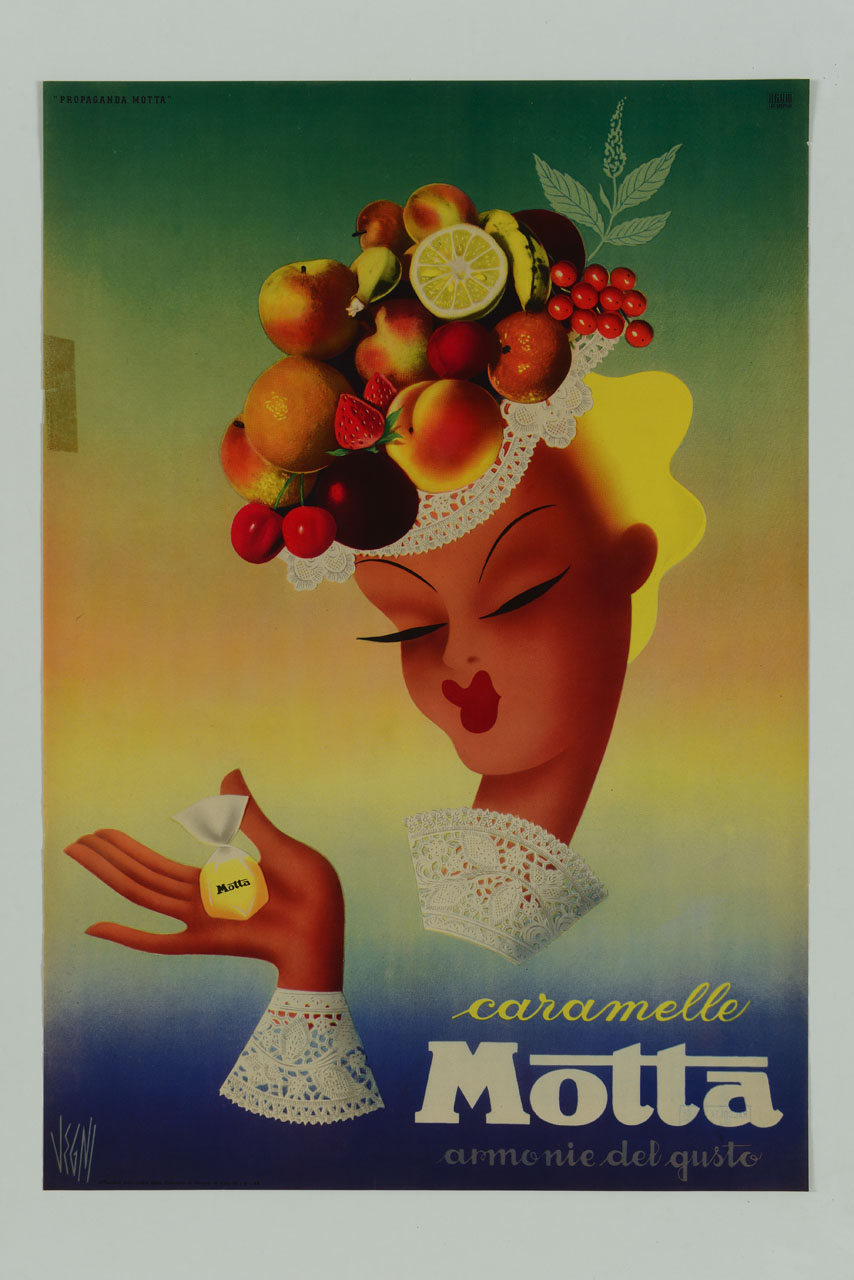 Lettura iconografica: figura femminile; caramella; cappello; frutta; ciliegia; fragola; pesca; prugna; banana; arancia; limone; mandarino; albicocca; menta. Categoria merceologica/ tipo evento: industria alimentare; dolciumi; caramelle. Nomi: Motta. Luoghi: Milano