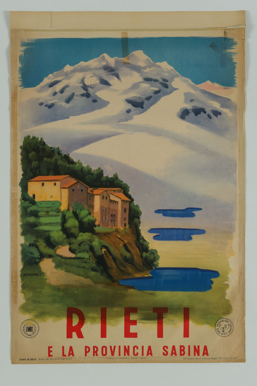 Lettura iconografica: architetture; case; sentiero; acqua; montagne; neve. Categoria merceologica/ tipo evento: turismo; campagna; montagna; enti di promozione turistica. Nomi: ENIT; Ente Nazionale per l'incremento delle Industrie Turistiche; Ente Provinciale Turismo Rieti; Provincia Sabina. Luoghi: Rieti