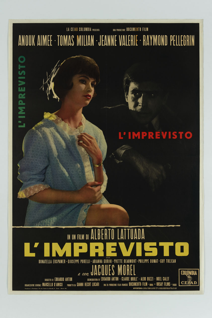 Lettura iconografica: ritratti; attori; buio. Categoria merceologica/ tipo evento: cinema italiano. Nomi: CEIAD Columbia; Compagnia Edizioni Internazionali Artistiche Distribuzione; Documento Film; Amouk Aimée; Tomas Milian; Jeanne Valerie; Raymond Pellegrin; Alberto Lattuada; L'imprevisto; Donatella Erspamer; Giuseppe Porelli; Arianna Corini; Yvette Beaumont; Philippe Dumat; Guy Trejean; Jacques Morel; Edoardo Anton; Claude Brulé; Aldo Buzzi; Noel Calef; Marcello D'Amico; Gianni Hecht Lucari; Orsay Films. Luoghi: Roma; Parigi
