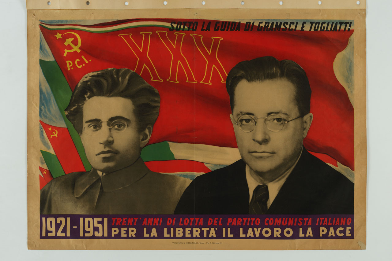 Lettura iconografica: figure maschili; ritratti; politici; Segretario del Partito Comunista Italiano; bandiera tricolore; bandiera con falce e martello. Categoria merceologica/ tipo evento: informazione e comunicazione; propaganda comunista; manifestazioni culturali; commemorazioni; commemorazione storica; politica; partiti politici. Nomi: Trentennale della fondazione del Partito Comunista Italiano; Antonio Gramsci; Palmiro Togliatti; PCI; Partito Comunista Italiano