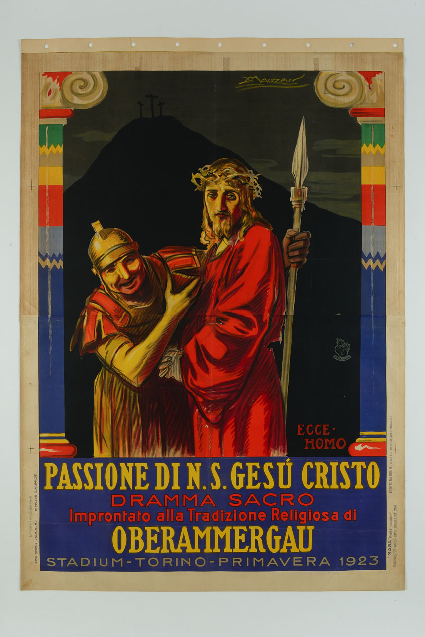 Lettura iconografica: figure maschili; soldato; lancia; Gesù Cristo; corna di spine; tunica; colonne. Categoria merceologica/ tipo evento: religione cattolica; spettacolo; teatro; prosa. Nomi: Passione di Nostro Signore Gesù Cristo; Ecce Homo; Oberammergau; Stadium. Luoghi: Torino