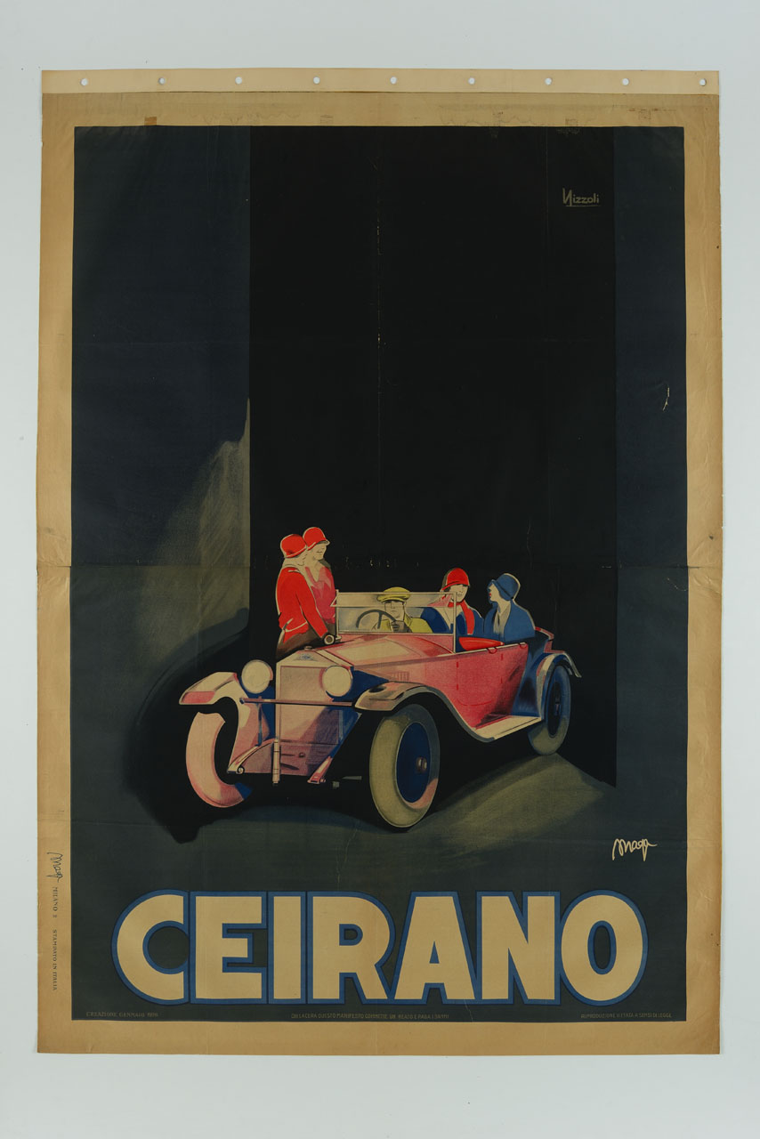 Lettura iconografica: automobile; figure femminili; cappelli; figura maschile; autista; edificio. Categoria merceologica/ tipo evento: industria meccanica; mezzi di trasporto; automobile. Nomi: Ceirano. Luoghi: Torino