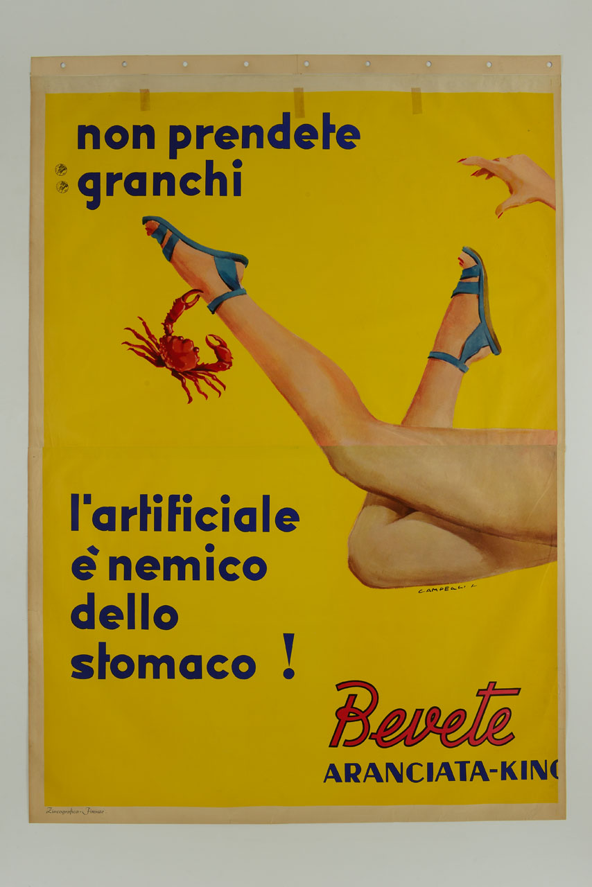 Lettura iconografica: figura femminile; cappello da marinaio; sandali; granchio; bottiglia a forma di arancia. Categoria merceologica/ tipo evento: industria alimentare; bevande; aranciata; cola; chinotto; acqua minerale. Nomi: Enrico Scotti & Figli; Acqua Roveta; Spremuta d'arancio Roveta. Luoghi: Firenze; Scandicci