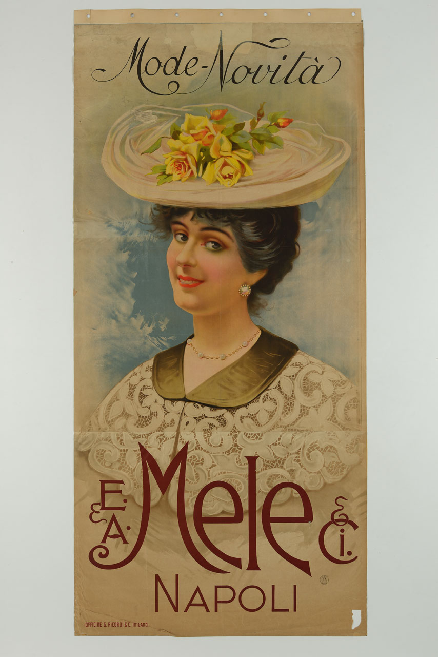 Lettura iconografica: figura femminile; cappello; rose gialle; mantellina in pizzo. Categoria merceologica/ tipo evento: commercio; grandi magazzini; moda; abbigliamento. Nomi: E. & A. Mele & C.i.; Emmiddio Mele; Alfonso Mele; fratelli Mele; Palazzo della Borghesia; Grandi Magazzini Mele. Luoghi: Napoli