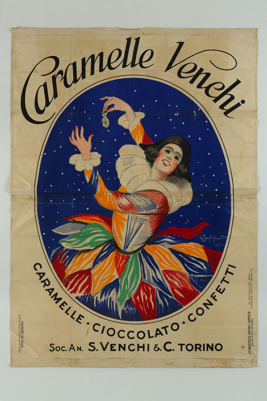 Lettura iconografica: figura femminile; maschera di carnevale. Categoria merceologica/ tipo evento: industria alimentare; dolciumi; confetti; caramelle; cioccolato. Nomi: Caramelle Venchi; Caramella digestiva menta-genziana Venchi; Società Anonima Silvano Venchi & C.; Arlecchino. Luoghi: Torino