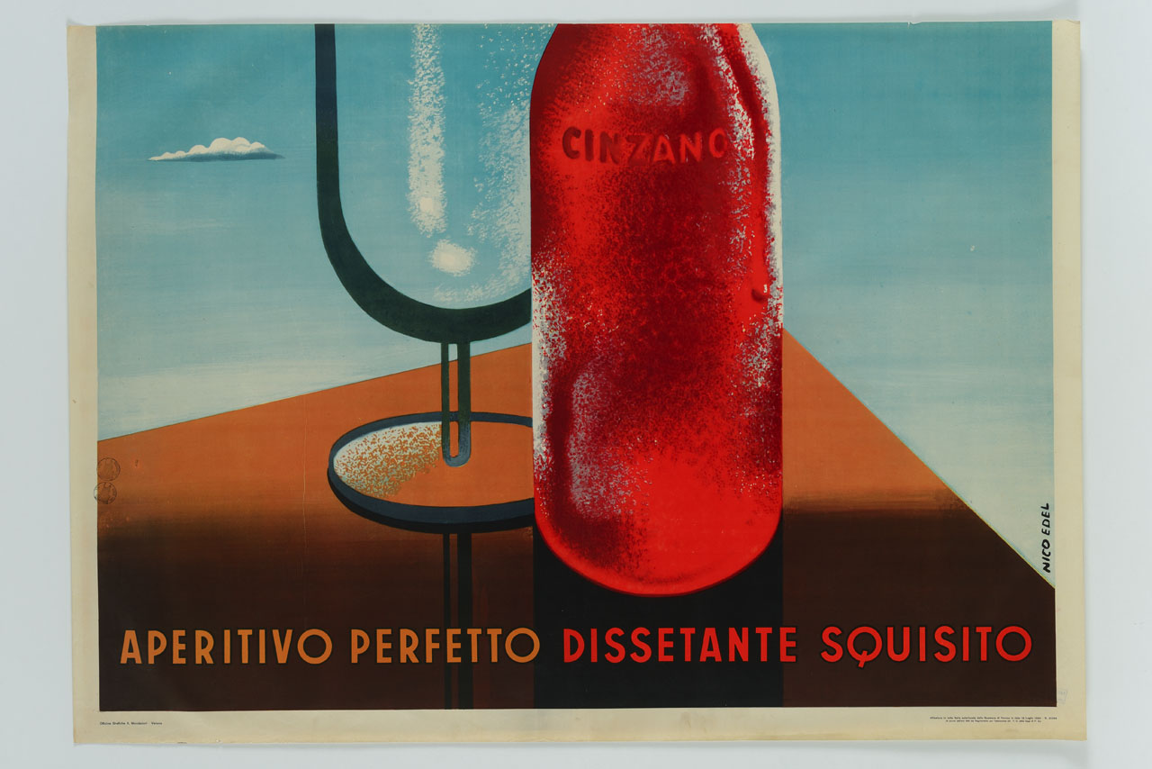 Lettura iconografica: bottiglia; bicchiere; tavolino; tenda a righe rosse e blu. Categoria merceologica/ tipo evento: industria alimentare; bevande; soda. Nomi: Cinzano; Cinzano Soda; Giovanni Giacomo Cinzano; Carlo Stefano Cinzano; Davide Campari Milano S.p.A. Luoghi: Torino