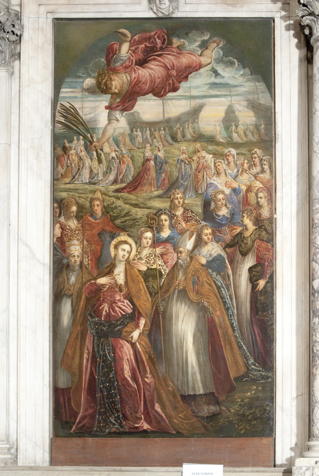 - NOTIZIE STORICO CRITICHE Proviene, come le altre due pale del Veronese e del Salviati, dalla chiesa degli Incurabili. Dopo le soppressioni napoleoniche, la pala venne portata a San Lazzaro, consegnata alla Direzione del Civico Ospedale di Venezia per ordinanza del 1° febbraio 1832. La datazione dell'opera è controversa: se Pallucchini-Rossi la considerano eseguita dal Tintoretto in epoca relativamente giovanile (1554-55), Aikema, sulla base della datazione dell'abbigliamento e delle acconciature, considerate da studiosi della materia risalenti al 1573-75, la posticipa a quegli anni. Inoltre la nuova chiesa degli Incurabili fu edificata dopo il 1566 ed è presumibile che anche le pale degli altari fossero eseguite dopo tale data. Anche l'iconografia è un unicum: Sant'Orsola è circondata da un papa, un vescovo e una figura femminile con corno ducale che personifica Venezia. Aikema ipotizza come spiegazione per tale rappresentazione un suo collegamento con la visita della futura santa Angela Merici a Venezia nel 1524, di ritorno da un viaggio in Terra Santa. La Merici fu ospitata dalla congregazione dei governatori e delle governatrici degli Incurabili. Il ricordo di tale visita durò a lungo, ravvivato negli ultimi decenni del Cinquecento, quando furono confermate le regole della Compagnia di Sant'Orsola. In quest'ottica, la pala, che mostra la santa protetta e venerata dalla Chiesa e da Venezia, diventa un omaggio ad Angela Merici, la "santa assistenziale" e protettrice delle convertite, che, prima di trasferirsi in un altro istituto alla Giudecca, erano alloggiate negli Incurabili