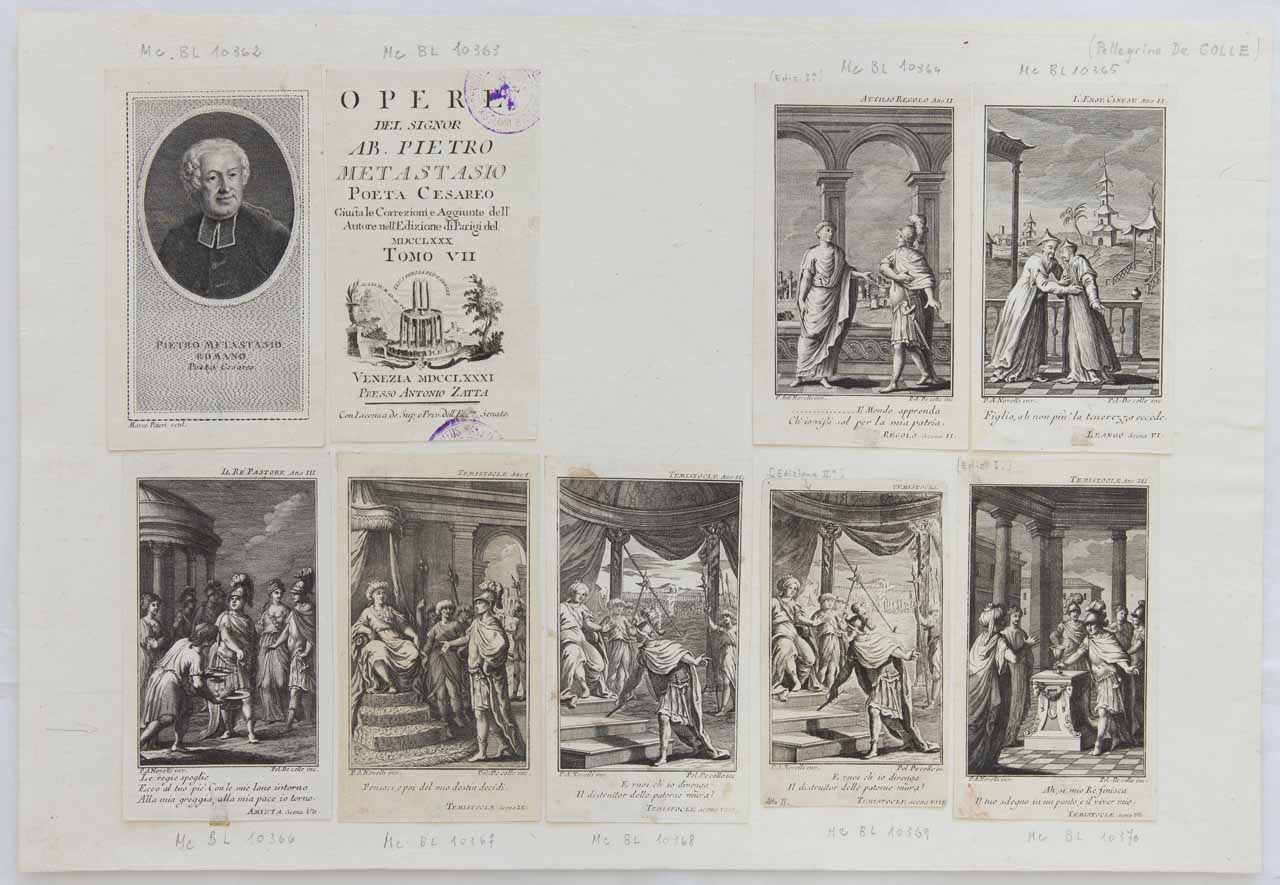 - NOTIZIE STORICO CRITICHE La stampa appartiene al gruppo d’illustrazioni commissionate da Antonio Zatta a De Col per accompagnare l'edizione completa delle Opere di Metastasio, pubblicate per la prima volta a Venezia nell’ottavo decennio del Settecento. Per l’impresa il bellunese eseguì un totale di sette incisioni tratte da disegni di Pietro Antonio Novelli (1729-1804), impiegate per decorare sia la versione in 12° composta da sedici volumi (1781-1783), sia quella di lusso in 4°, con il testo suddiviso in sette volumi e un più ricco apparato ornamentale (1782-1784). Disposte all'inizio dei singoli atti dalle cui situazioni principali traggono ispirazione, le tavole a lui assegnate – sei delle quali, rimosse dal contesto originario e affiancate sul medesimo foglio, entrarono a far parte della collezione di Luigi Alpago-Novello – illustrano le vicende relative al Demofoonte (II, 2), al Temistocle (I, 9; II, 8; III, 11), a Il re pastore (II, 13), a L'eroe cinese (II, 6) e, per quello che riguarda l’esemplare in questione, all'Attilio Regolo (II, 2). Tali melodrammi sono tutti compresi tra il sesto e l'ottavo volume dell'edizione ordinaria, dati alle stampe, in anticipo di circa un anno rispetto alla versione più preziosa, tra il 1781 e il 1782; è pertanto questo biennio il termine ante-quem per circoscrivere la collaborazione del bellunese con la tipografia di Antonio Zatta, nella quale, a distanza di pochi anni, vennero riutilizzati alcuni dei medesimi rami per illustrare le Tragedie di Francesco Ringhieri, pubblicate in otto volumi tra il 1788 e il 1789