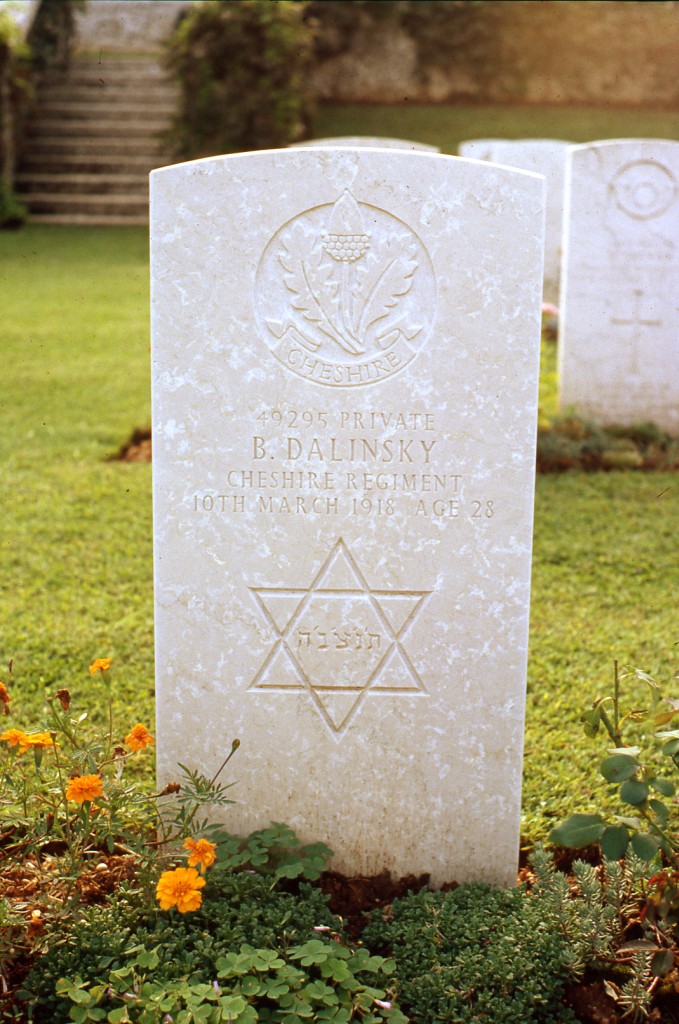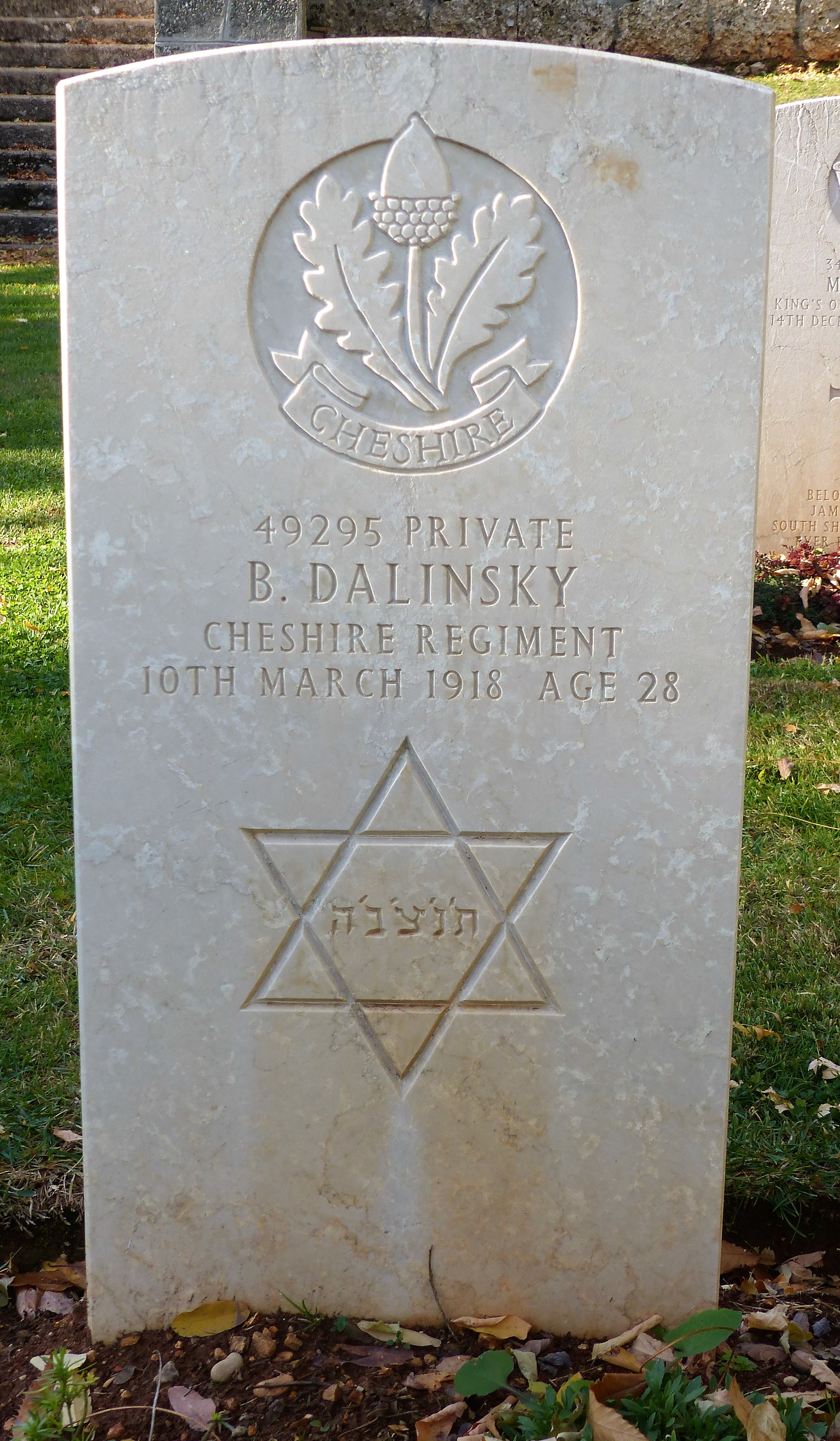 Stele sepolcrale eretta, rettangolare, dal lato superiore lievemente tondeggiante. Inferiormente all'epigrafe è incisa la stella di Davide. In alto compare lo stemma reggimentale scolpito a rilievo, ottenuto attraverso l'abbassamento del piano della circonferenza nel quale è inscritto