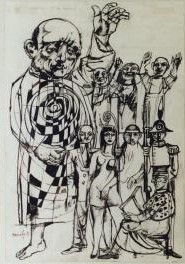 Disegno eseguito con inchiostro su foglio di carta bianca. A sinistra, grande pupazzo con costume decorato con motivi geometrici-astratti (simbolo dello Stato Capitalista) con braccio levato e mano aperta (come se dovesse manovrare i fili di un gruppo di marionette); a destra, otto personaggi teatrali, raffigurati in scala minore rispetto al pupazzo, appartenenti al Popolo, allo Stato e alla Chiesa