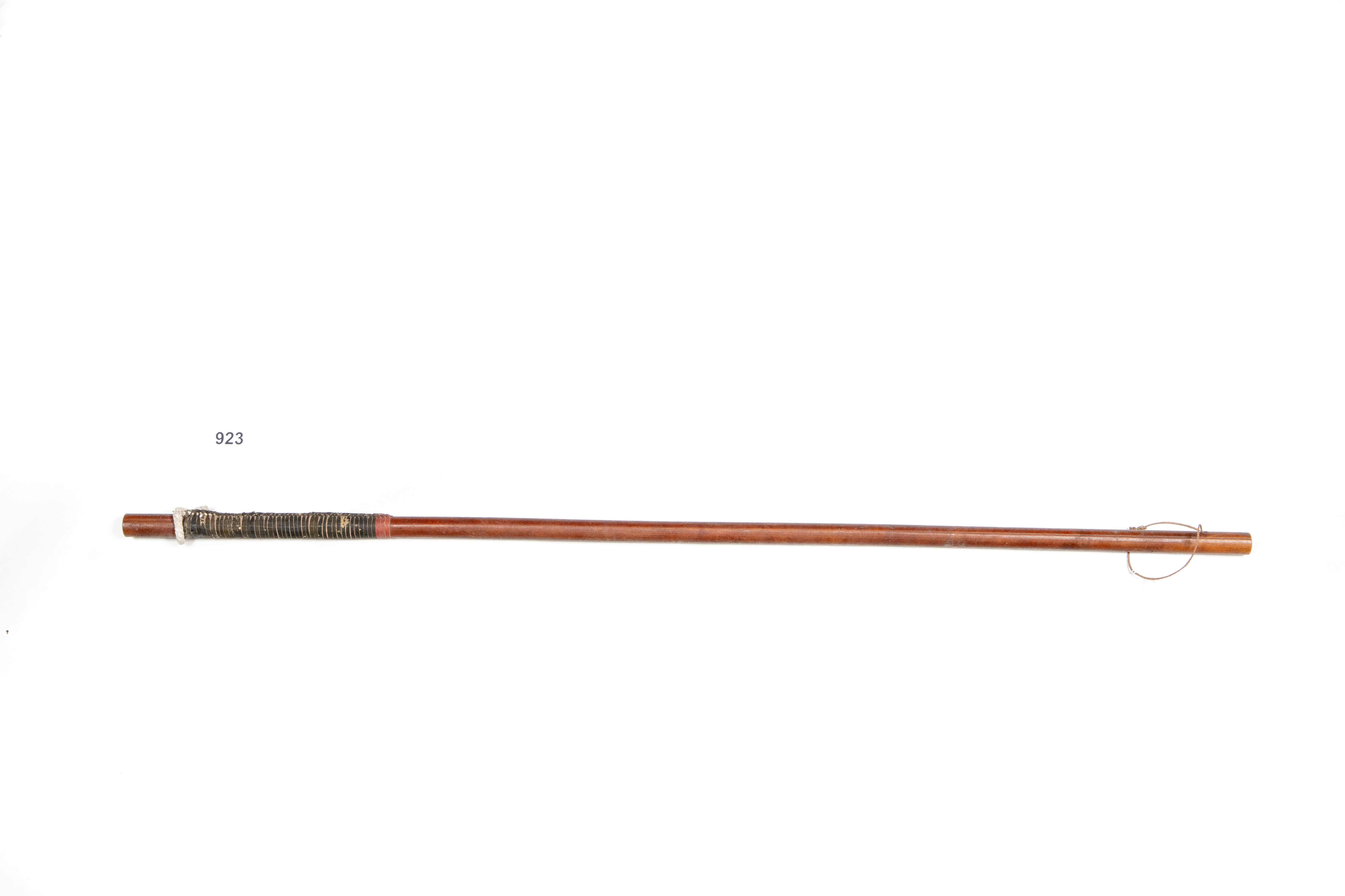 Bastone in legno con impugnatura decorata da strisce di pelle intrecciate e colorate in rosso e nero