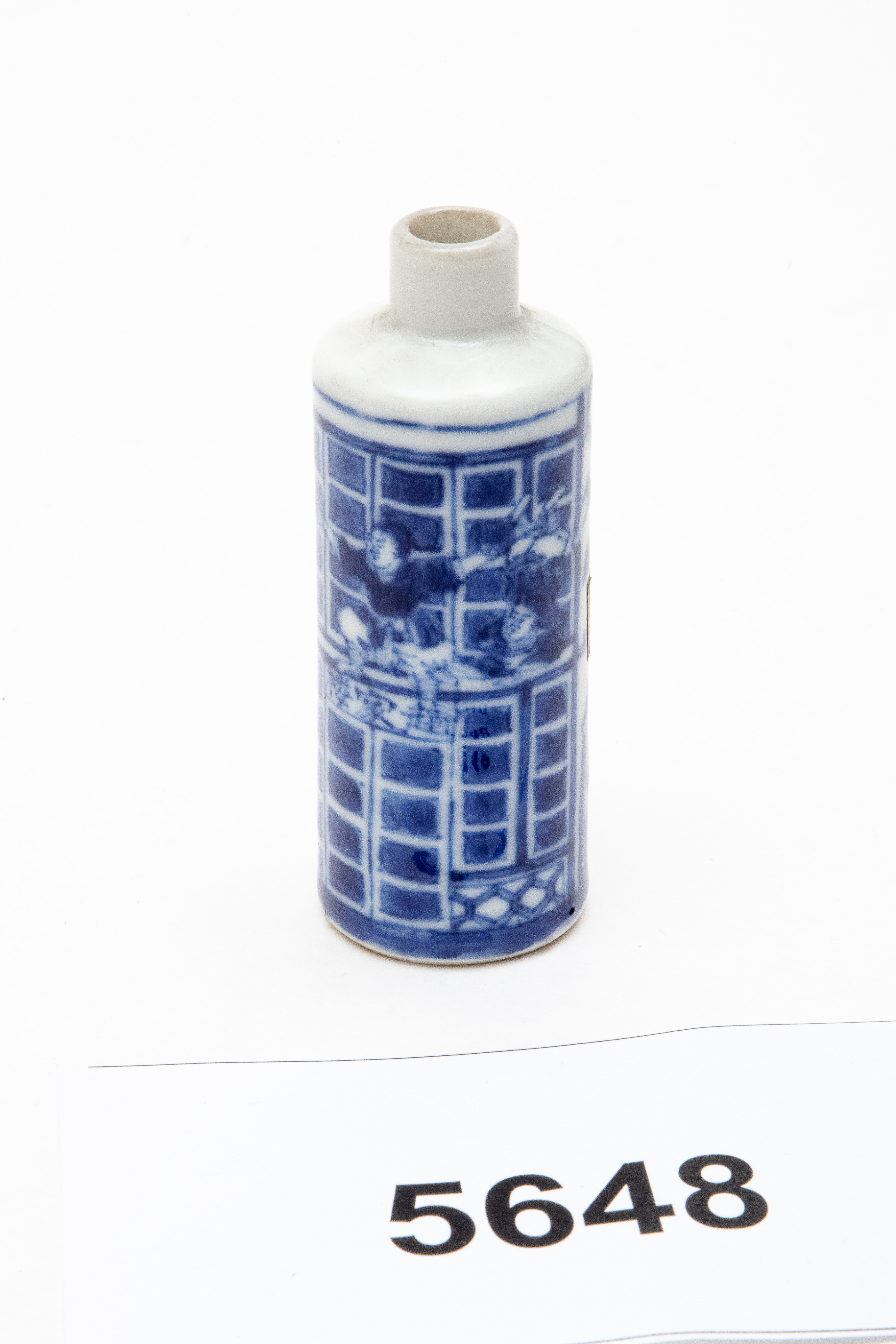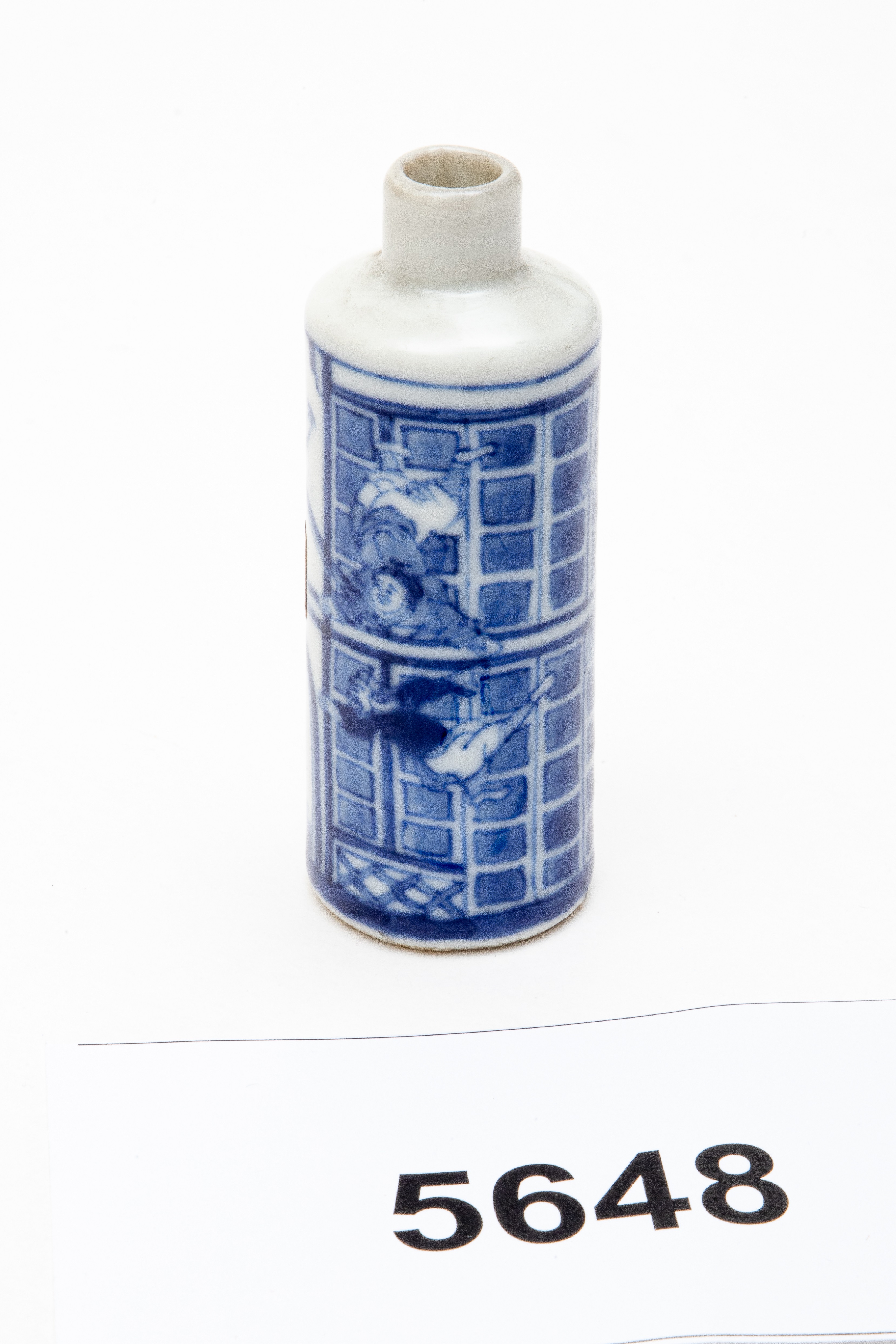 Tabacchiera in flacone detta anche "snuff bottles" in porcellana bianca e blu caratterizzata da una raffigurazione di equilibristi che fanno acrobazie davanti a un edificio, probabilmente la casa di un funzionario