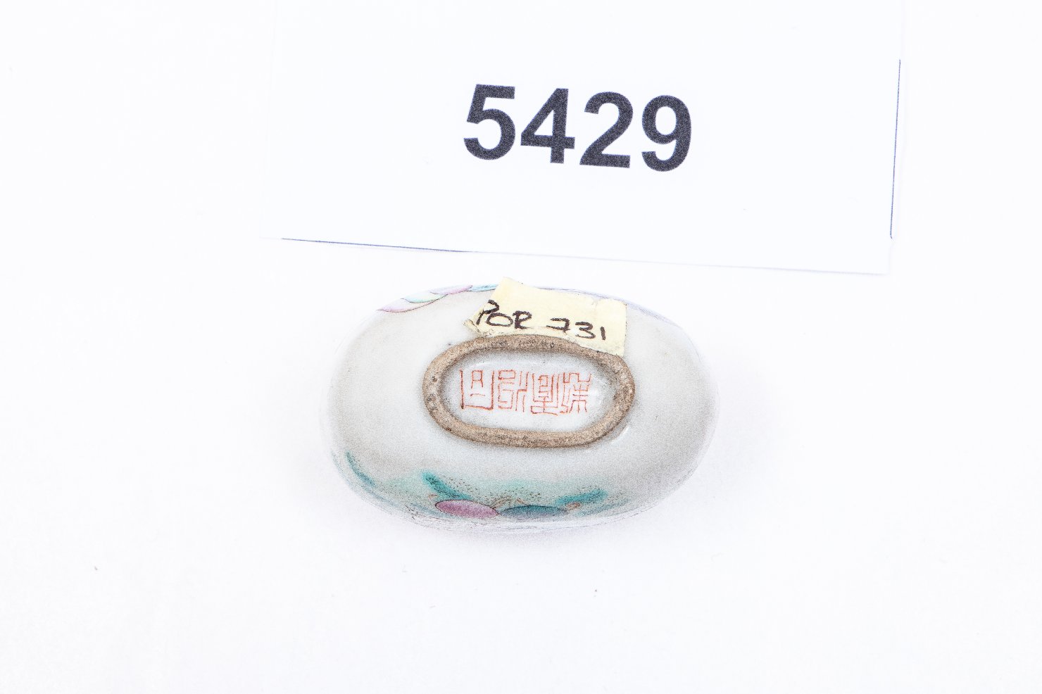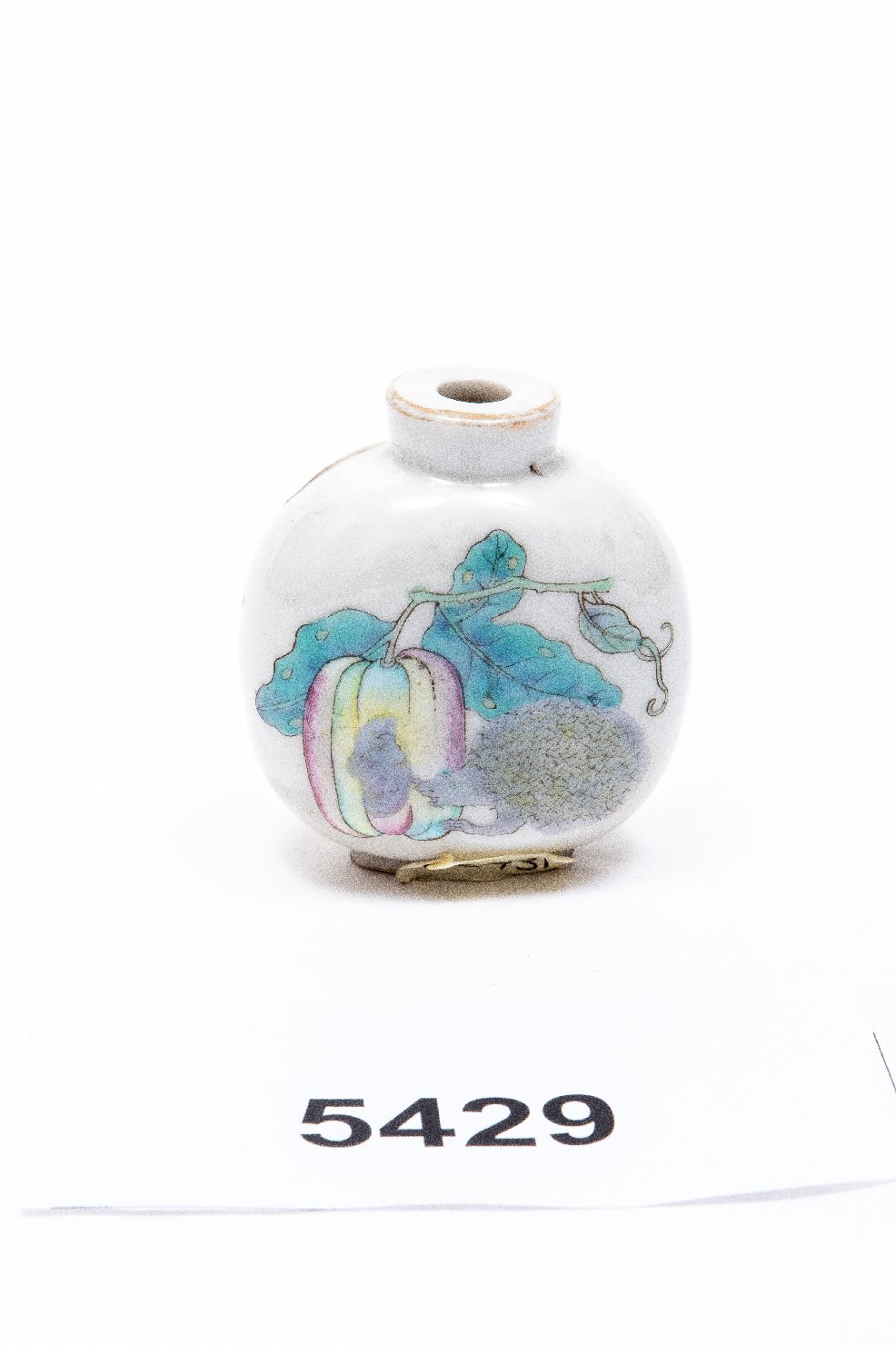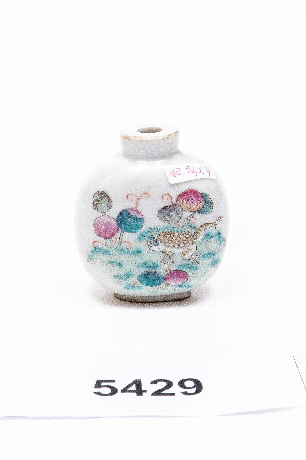 Tabacchiera in flacone detta anche "snuff bottle" in porcellana policroma. La decorazione è diversa sui due lati: da un parte un porcospino mangia una zucca, mentre sull’altra un rana salta in mezzo ai funghi su un prato. Sotto la base presenta un marchio riportante l'anno di fabbricazione