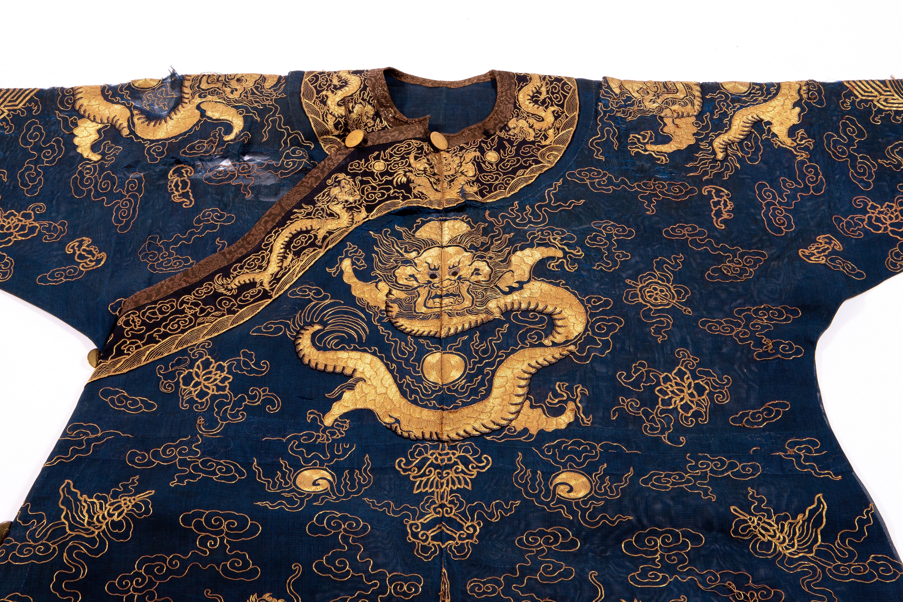 - NOTIZIE STORICO CRITICHE Abito semi-informale di corte (jifu) di un nobile cinese fino al terzo rango, come si può dedurre dal colore del fondo blu intenso e lo scollo rotondo con apertura diagonale destra. L'abito è decorato a vista con 5 draghi a quattro artigli: due draghi frontali sulle spalle e sul petto, due di profilo sulla parte inferiore. La decorazione dell'abito copre l'intera superficie e rappresenta schematicamente la concezione cinese dell'universo: nella parte inferiore vi è l'acqua, da cui spunta la terra, simboleggiata qui da una montagna, e infine il cielo, dove si muovono i draghi, accompagnati da pipistrelli, simbolo di buona fortuna. Il colletto dell'abito è anch'esso decorato con numerosi draghi. La veste presenta anche gli 8 simboli tibetani di buon auspicio, legati al buddhismo: nella parte frontale, sono visibili diversi fiori di loto (purezza), due pesci d'oro (superamento della sofferenza), due vasi della ricchezza (ottenimento e soddisfazione dei beni materiali), parasole al di sotto del drago frontale (regalità, potere, compassione e protezione), vessillo della vittoria (vittoria degli insegnamenti buddhisti) e la ruota del Dharma (globalità dell'insegnamento buddhista). Sulle maniche ci sono due nodi infiniti (rapporto fra tutte le cose, infinita saggezza e conoscenza del Buddha)
