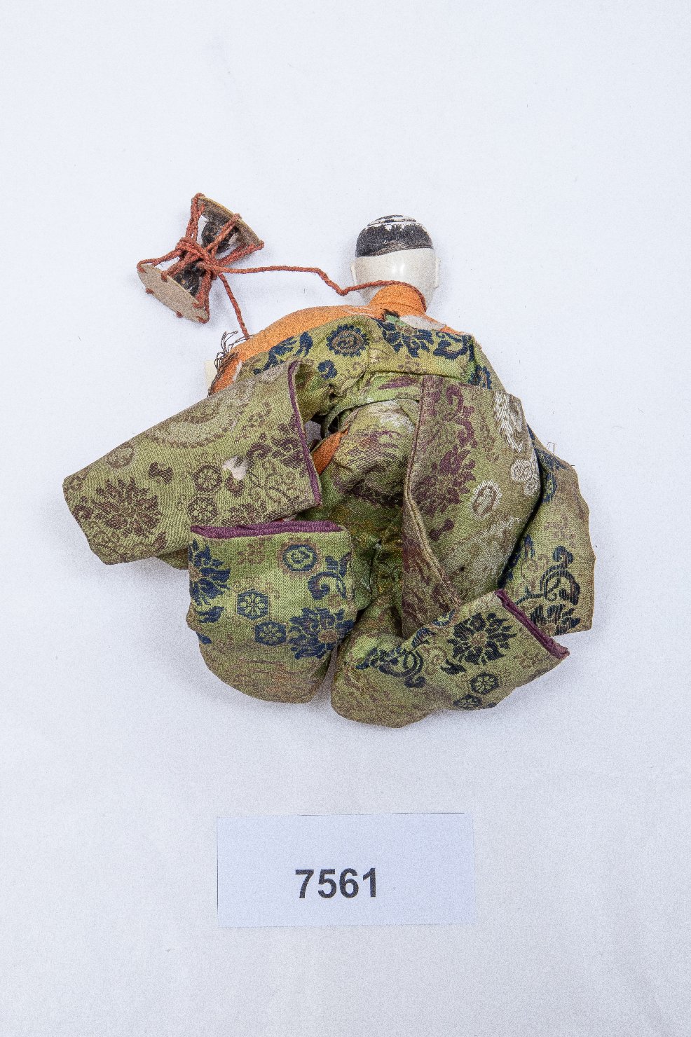 Bambola giapponese detta "hina ningyo" che fa parte della categoria delle "yūsoku-bina", ovvero bambole che rappresentano le abitudini e i costumi della corte imperiale. In questo caso la bambola rappresenta un suonatore di tamburo di piccola taglia "kotsuzumi". Indossa un kimono di crespo di seta (chirimen) arancione con ricami in rilievo di nuvole e gru, e dei pantaloni "hakama" di seta verde con motivi floreali blu e bianchi