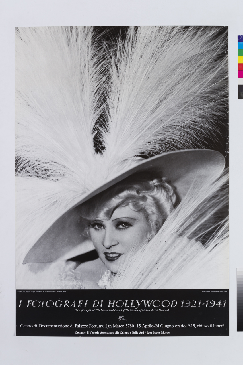 Lettura iconografica: riproduzione fotografica di fotografia; figura femminile; donna; ritratto; attrice; cappello; piume. Categoria merceologica/tipo evento: manifestazioni culturali; mostre; mostra d'arte; fotografia; istituzioni culturali; musei; museo d'arte; amministrazione pubblica; enti locali; amministrazione comunale. Nomi: Mae West; Mary Jean West; Eugene Robert Richee; The Kobal Collection; John Kobal; The International Council of the Museum of Modern Art; Centro di Documentazione di Palazzo Fortuny; Palazzo Fortuny; Comune di Venezia; Assessorato alla Cultura e Belle Arti. Luoghi: Venezia; Londra; New York