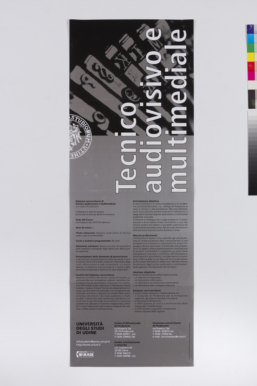 Lettura iconografica: strumento meccanico; macchina da scrivere; martelli di macchina da scrivere; lettere; caratteri. Categoria merceologica/tipo evento: istruzione; università; amministrazione pubblica; enti locali; amministrazione provinciale; istituzioni culturali. Nomi: Università degli Studi di Udine; Centro Polifunzionale di Pordenone; Consorzio Universitario di Pordenone; Centro Orientamento e Tutorato; CLAV; Centro Linguistico e Audiovisivi; CRAF; Centro di Ricerca e Archiviazione della Fotografia; Provincia di Pordenone; Consorzio di Pordenone per la Formazione Superiore gli Studi Universitari e la Ricerca; Facoltà di Scienze della Formazione; Diploma universitario di Tecnico audiovisivo e multimediale. Luoghi: Udine; Pordenone; Spilimbergo