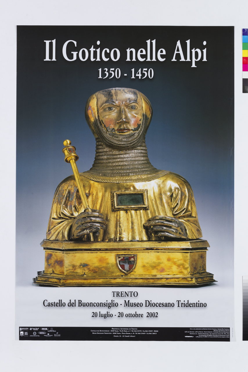 Lettura iconografica: riproduzione fotografica di opera; oreficeria; reliquiario a busto. Categoria merceologica/tipo evento: manifestazioni culturali; mostre; mostra d'arte; istituzioni culturali; musei; museo d'arte; trasporti; trasporto terrestre di merci; compagnia di trasporti e spedizioni; trasporto terrestre; compagnia ferroviaria; attività finanziarie e assicurative; banche; assicurazioni; associazioni economiche; turismo; terme; associazioni di promozione turistica; industria alimentare; bevande; vino; amministrazione pubblica; enti locali; amministrazione comunale; amministrazione provinciale; commercio; supermercato. Nomi: Il Gotico nelle Alpi; Castello del Buonconsiglio; Museo Diocesano Tridentino; Piccin; AXA; Dal Pra; Casse Rurali Trentine; Camera di Commercio Industria Artigianato e Agricoltura; Famiglia Cooperativa; Supermercati Trentini; Istituto di Tutela Trentino Grappa; Terme di Comano; Rotari; Provincia Autonoma di Trento; Servizio Attività Culturali; Servizio Beni Culturali; APT del Trentino; APT di Trento; Trento Iniziative; Consorzio Trentino Esposizioni; Trenitalia; Eurostar; Atesina. Luoghi: Trento; Comano
