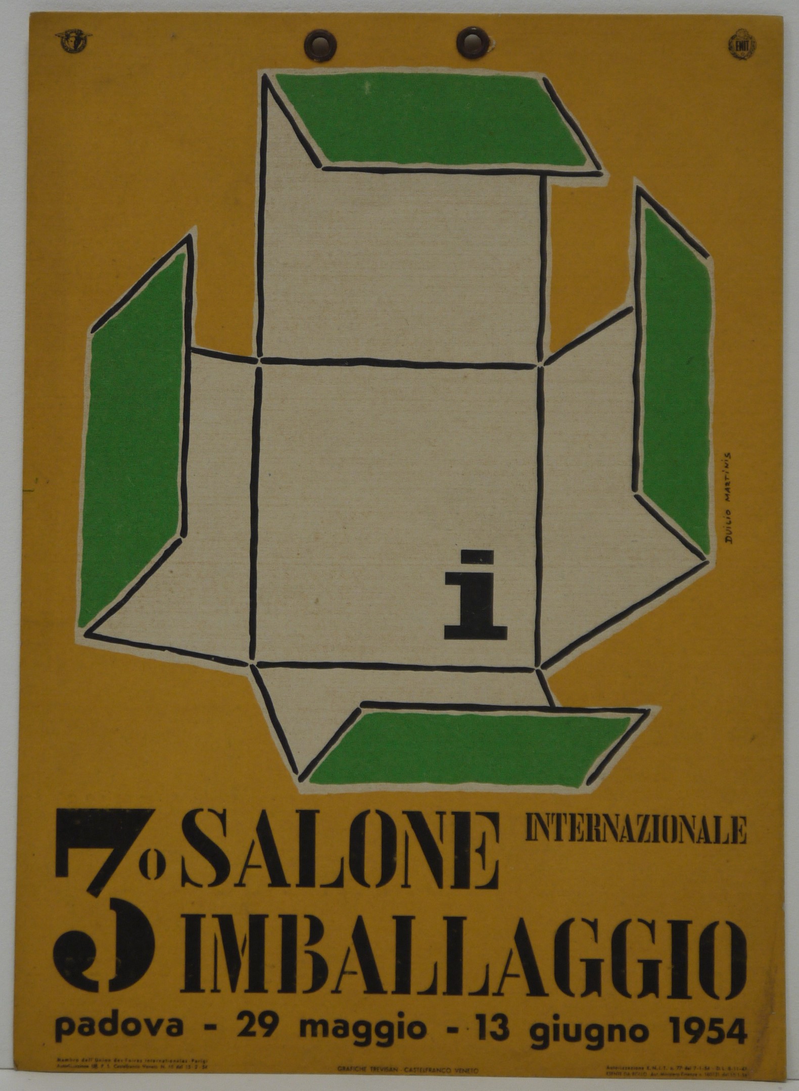 Lettura iconografica: sviluppo di scatola da imballaggio aperta con lettera "i" sovraimpressa. Categoria merceologica/tipo evento: evento fieristico; salone internazionale dell'imballaggio. Nomi: Duilio Martinis; Salone Internazionale Imballaggio; Union des Foires Internationales; Grafiche Trevisan; ENIT; Ministero Finanze. Luoghi: Padova, Parigi; Castelfranco Veneto