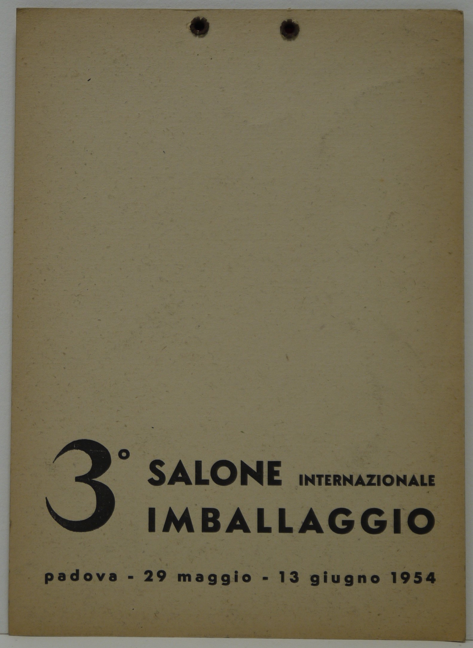 - ISCRIZIONI metà inferiore, in basso - 3o SALONE INTERNAZIONALE/ IMBALLAGGIO/ padova - 29 maggio - 13 giugno 1954 - stampatello maiuscolo -