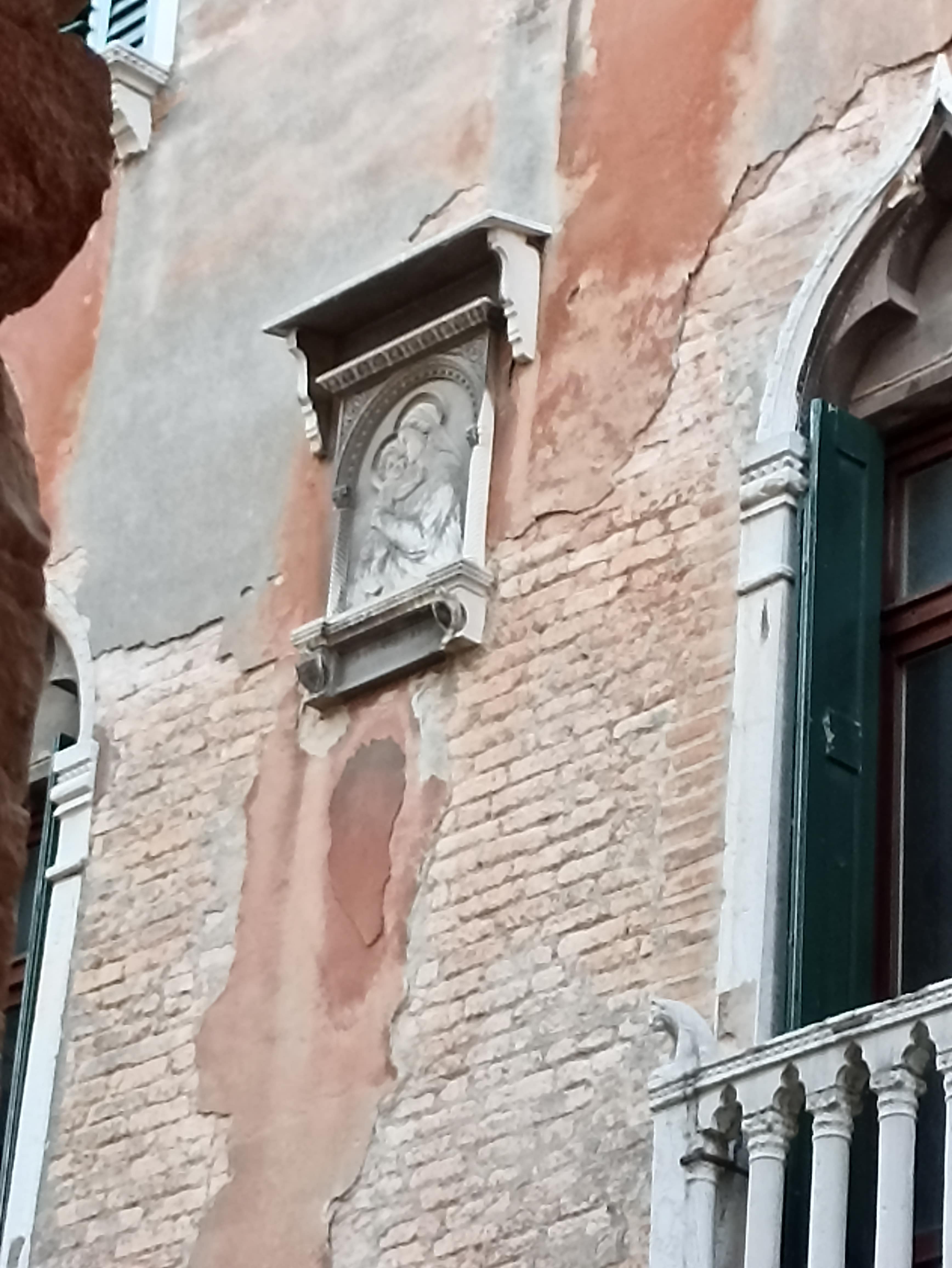 - NOTIZIE STORICO CRITICHE Durante la Prima Guerra Mondiale “Venezia, dal 24 maggio 1915 al 28 ottobre 1918, subì 42 incursioni aeree nemiche e sulla città caddero complessivamente 1039 bombe che provocarono 52 morti e 84 feriti nonché danni gravissimi al patrimonio abitativo e alle opere d’arte” (Giordani P., p. 28). L’iscrizione è a ricordo dell'attacco aereo subito a porzione di questa costruzione il 10 Agosto 1916 (19° incursione aerea): “Venezia bombardata da cinque velivoli austro-tedeschi che gettano sulla città trentuna bombe fra esplosive ed incendiarie.” (p. 82). Come visibile da immagini di repertorio, parte del tetto e dell’ultimo piano vennero distrutti. Sulla facciata sul rio di San Luca è visibile “un bassorilievo d’una Madonna col Bambino: GRATI ANIMI ERGO / 10 Agosto 1916” (notizia tratta da “Lapidi Veneziane” p. 437)