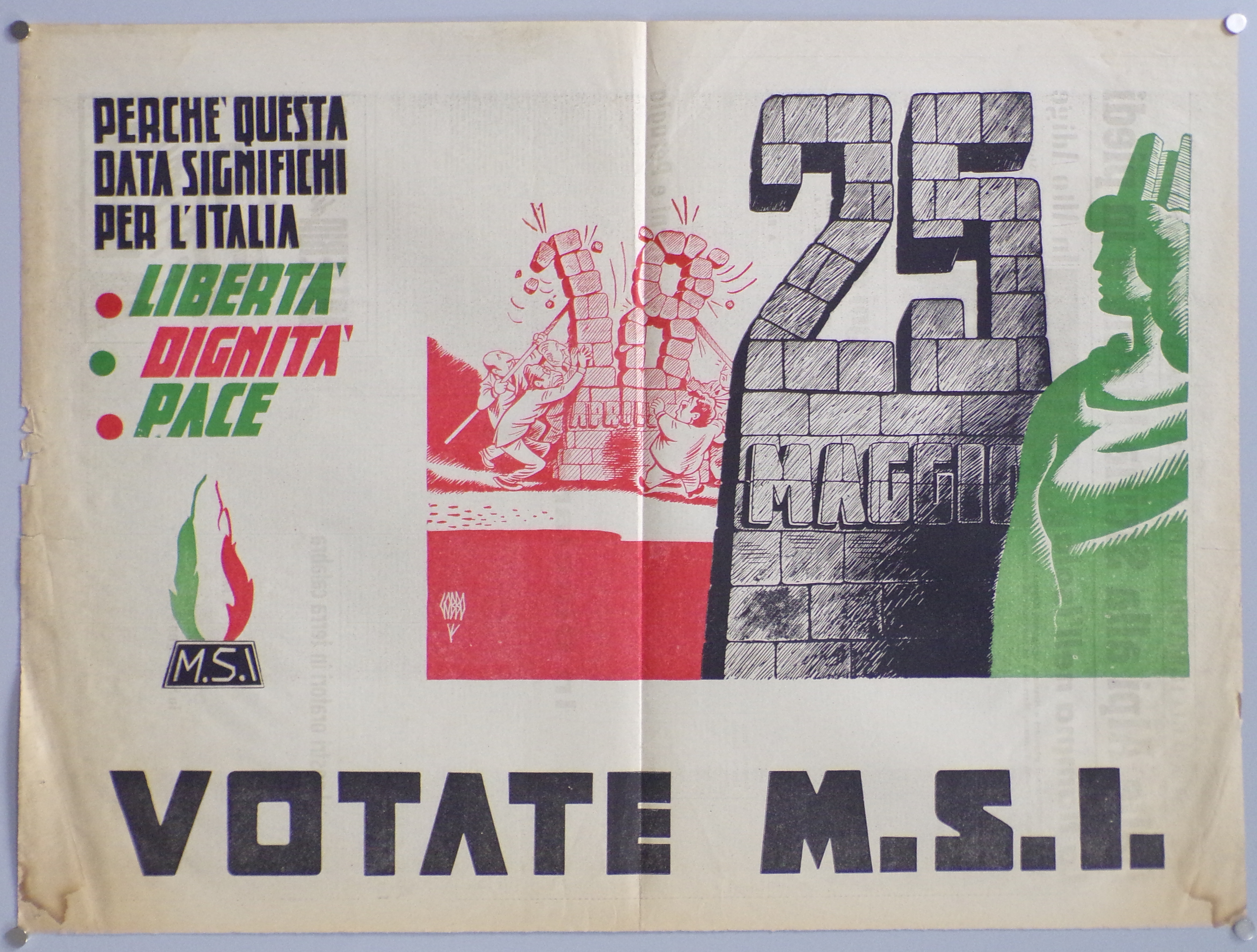 25 Maggio vota M.S.I. Vignetta tricolore: Italia turrita in verde presso un monumento alle elezioni del 25 Maggio 1958 realizzato in opus isodomum con pietre ben squadrate. Sullo sfondo De Gasperi e altri politici cercano di puntellare un monumento al 18 aprile 1948
