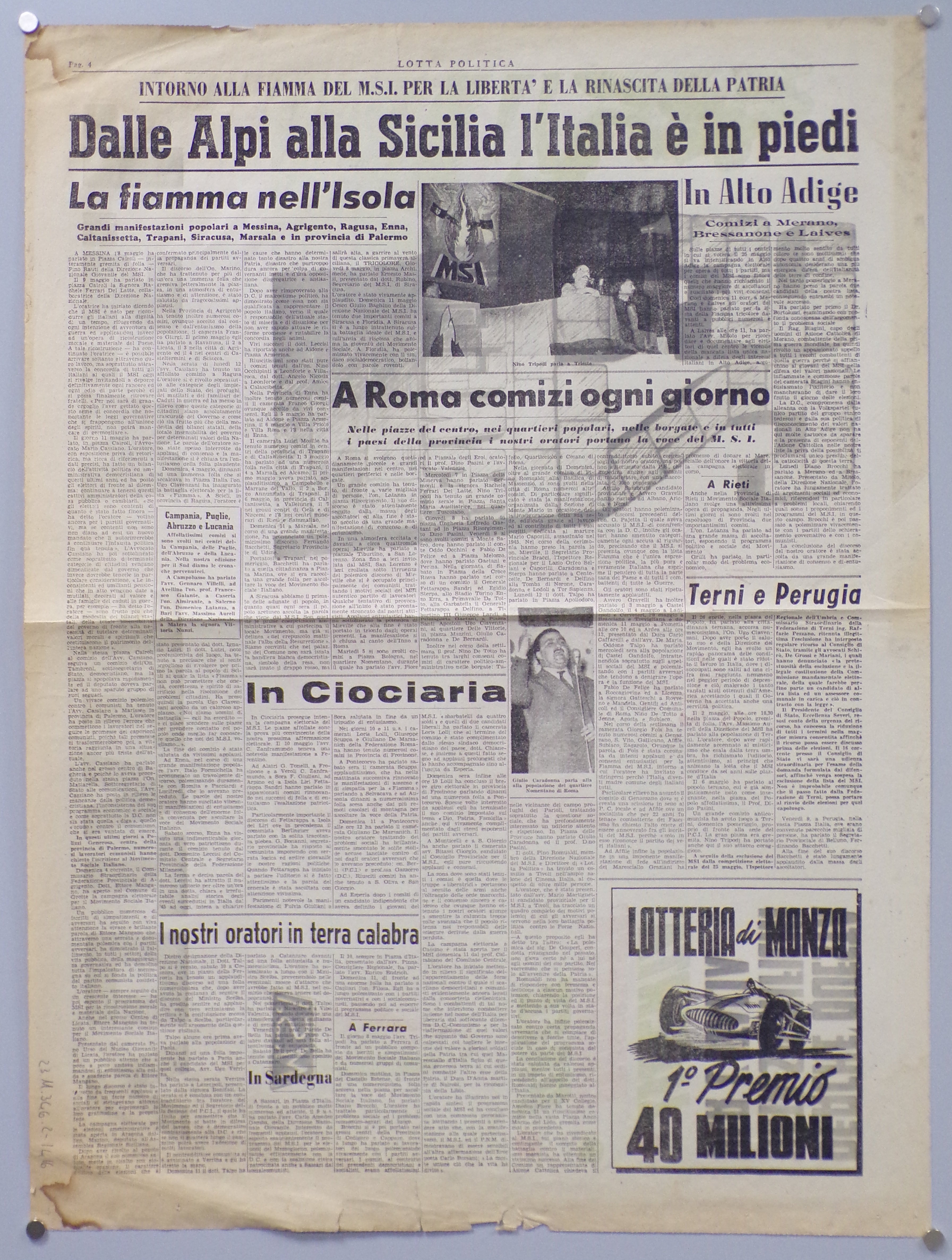 Lettura iconografica: fiamma tricolore simbolo M.S.I.; pietre; puntelli; monumento alle elezioni del 18 aprile 1948; monumento alle elezioni del 25 maggio 1958; figura allegorica; Italia turrita; politici italiani; caricature; Alcide De Gasperi. Categoria merceologica/tipo evento: comunicazione istituzionale; propaganda politica. Nomi: M.S.I.; Nino Tripodi; Giulio Caradonna; Gennaro Villelli; Francesco Galante; Giorgio Almirante; Domenico Latanza; Massimo Aureli; Vittoria Nunzi. Luoghi: Trieste; Messina; Agrigento; Ragusa; Enna; Caltanissetta; Trapani; Siracusa; Marsala; Palermo; Alto Adige; Merano; Bressanone; Laives; Roma; Campania; Puglia; Abruzzo; Basilicata; Rieti; Terni; Perugia; Ciociaria; Sardegna; Calabria; Ferrara; Monza