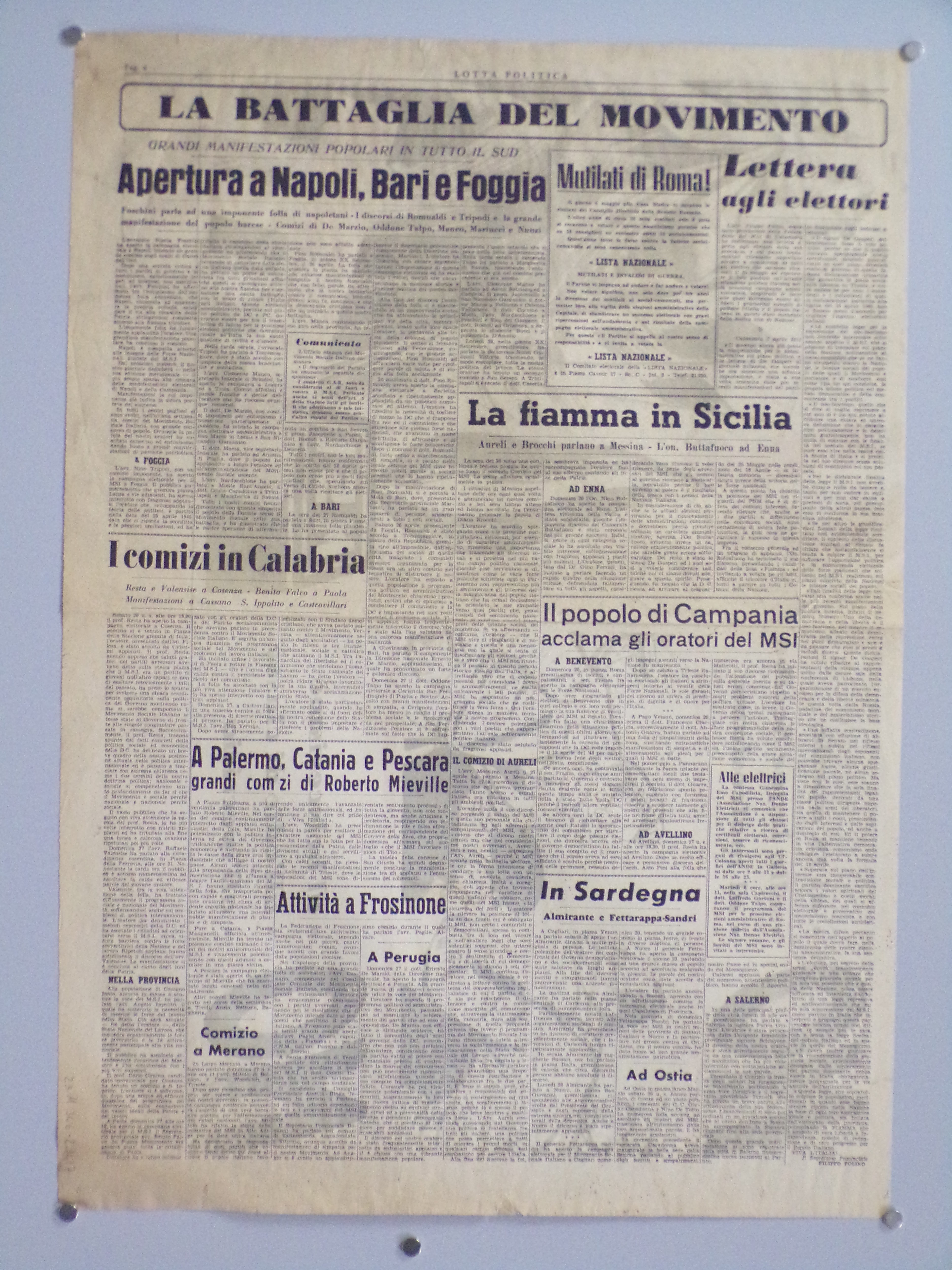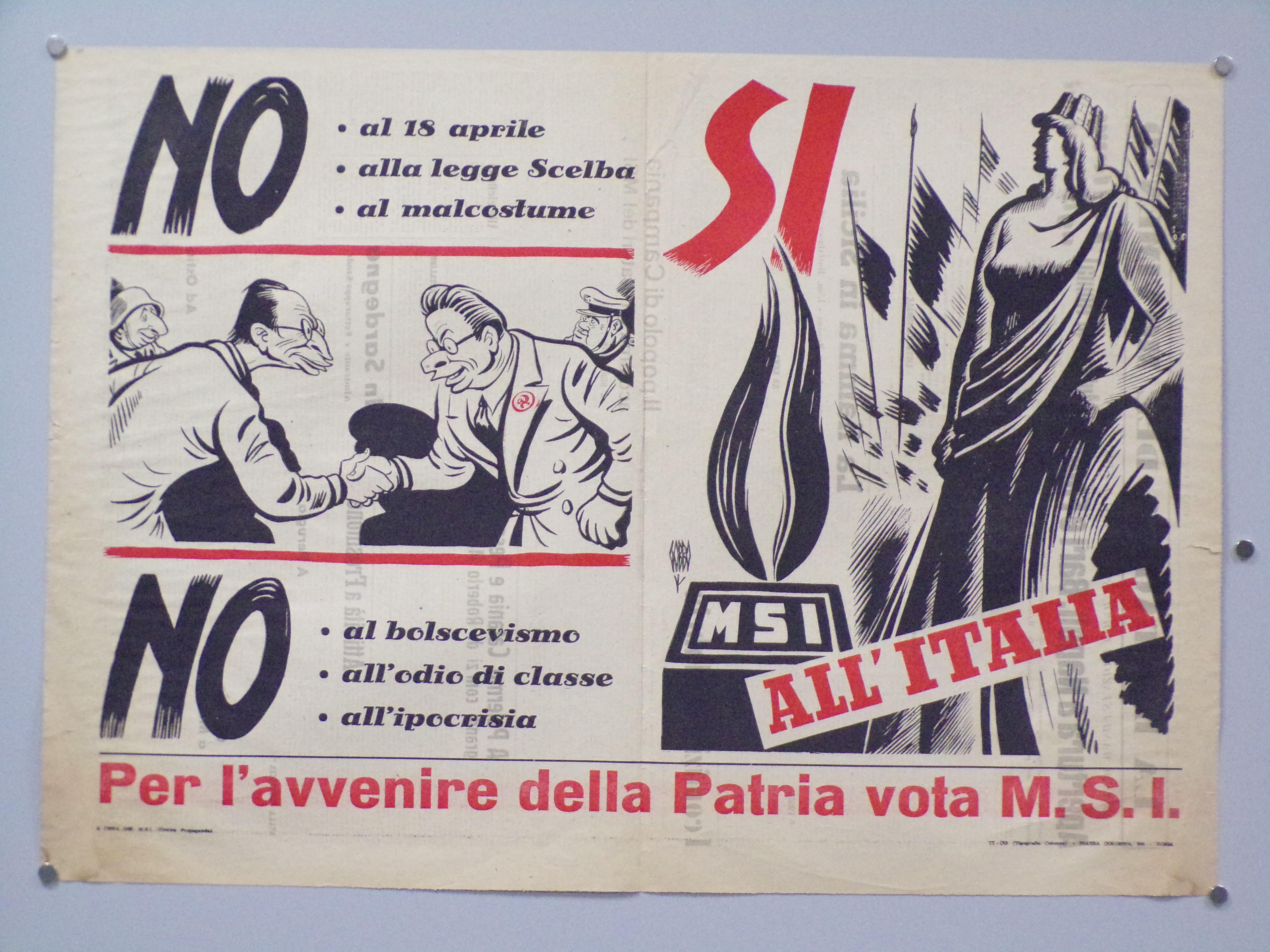 Lettura iconografica: fiamma tricolore simbolo M.S.I.; figura allegorica; Italia turrita; bandiere tricolore italiane; politici italiani; caricature; Alcide De Gasperi; Palmiro Togliatti; militari. Categoria merceologica/tipo evento: comunicazione istituzionale; propaganda politica. Nomi: M.S.I.; Mario Scelba; TI-CO; Tipografia Colonna; Pino Romualdi; Nino Tripodi; Ernesto De Marzio; Oddone Talpo; Clemente Manco; Vittoria Nunzi; Massimo Aureli; Benito Falvo; Giorgio Almirante; Roberto Mieville; Giuseppina Emo Capodilista; Loffredo Gaetani; Associazione Nazionale Donne Elettrici; Filippo Folino. Luoghi: Napoli; Bari; Foggia; Roma; Messina; Enna; Calabria; Cosenza; Paola; Cassano S. Ippolito; Castrovillari; Campania; Benevento; Avellino; Palermo; Catania; Pescara; Frosinone; Perugia; Merano; Sardegna; Ostia
