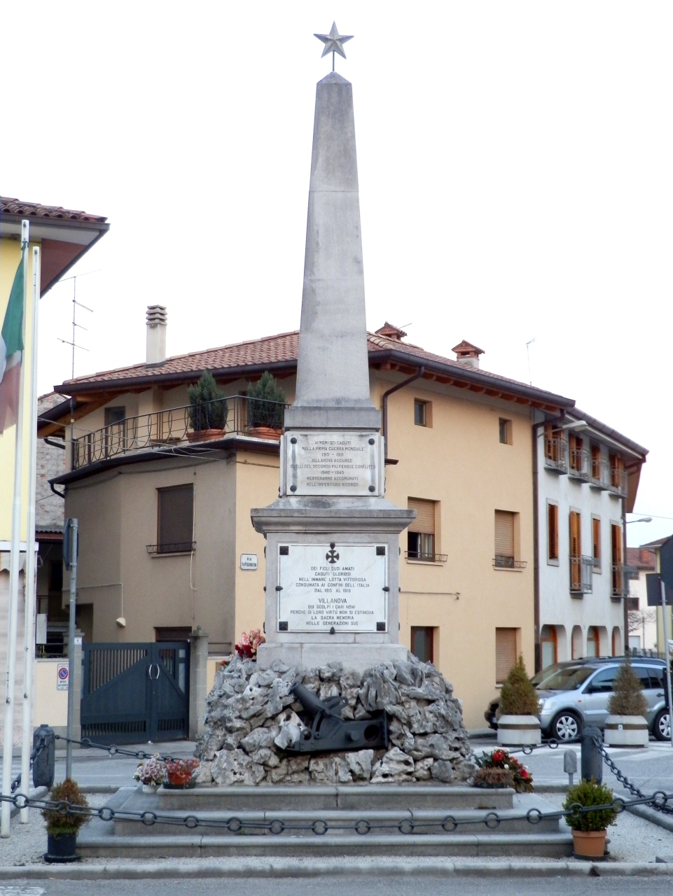 - ISCRIZIONI sul podio/ lato frontale/ lapide al centro - DEI FIGLI SUOI AMATI/ CADUTI GLORIOSI/ NELL'IMMANE LOTTA VITTORIOSA/ CONSUMATA AI CONFINI DELL'ITALIA/ DAL 1915 AL 1918 // VILLANOVA/ QUI' SCOLPI' I CARI NOMI/ PERCHE' DI LORO VIRTU' NON SI ESTINGUA/ LA SACRA MEMORIA/ NELLE GENERAZIONI SUE - maiuscolo - a incisione/ piombatura - italiano