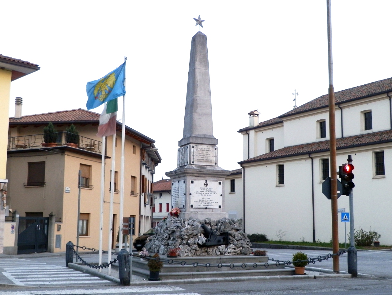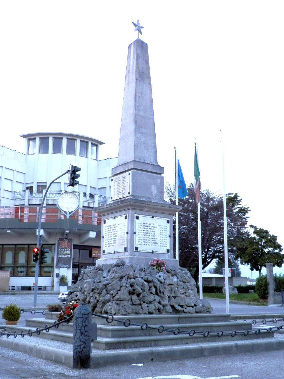 Il manufatto è posto al centro della piazza, sul lato est della SR463, a ridosso di un incrocio con semafori. L'area di rispetto è definita da un cordolo quadrangolare e delimitata da una catena sostenuta da quattro proiettili di bombarda da 240, disposti agli angoli. Tre gradini innalzano la parte basale costituita da un cumulo di pietre del Carso nelle quali frontalmente è incastonata una bombarda italiana da 58B. Da questo basamento emerge un podio modanato con cornice aggettante, in blocchi di pietra calcarea. Le sue superfici recano infisse le quattro lapidi in marmo bianco commemorative dei caduti della prima guerra mondiale. Queste sono fissate agli angoli con delle borchie quadrate in bronzo a motivo floreale e a metà dei lati da altrettante zanche cuspidate. Al di sopra si eleva l'obelisco contraddistinto da un basso zoccolo con cornice, con le tre lapidi della seconda guerra, fissate con borchie bronzee rotonde. Sulla sommità una piccola asta eleva una stella a cinque punte di metallo
