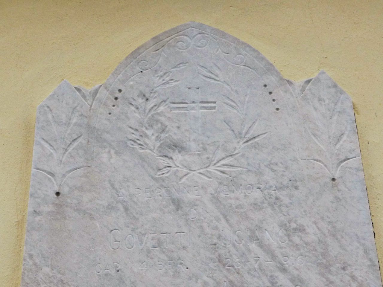 - ISCRIZIONI al centro - A PERENNE MEMORIA/ DI/ GOVETTI LUCIANO/ CAP. 14 BER. + 26-7-1916/ CARNELOS ANGELO/ SOL. 6 BER. -11-1918/ NOVELLO VALENTINO/ SOL. 115 FAN. + 4-11-1918/ CADUTI PER LA PATRIA/ PEGNO DI FERMEZZA E FEDE/ I COMPAGNI POSERO - maiuscoletto - a incisione -