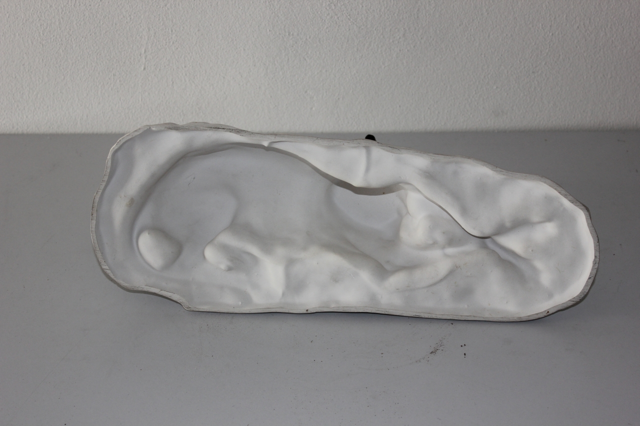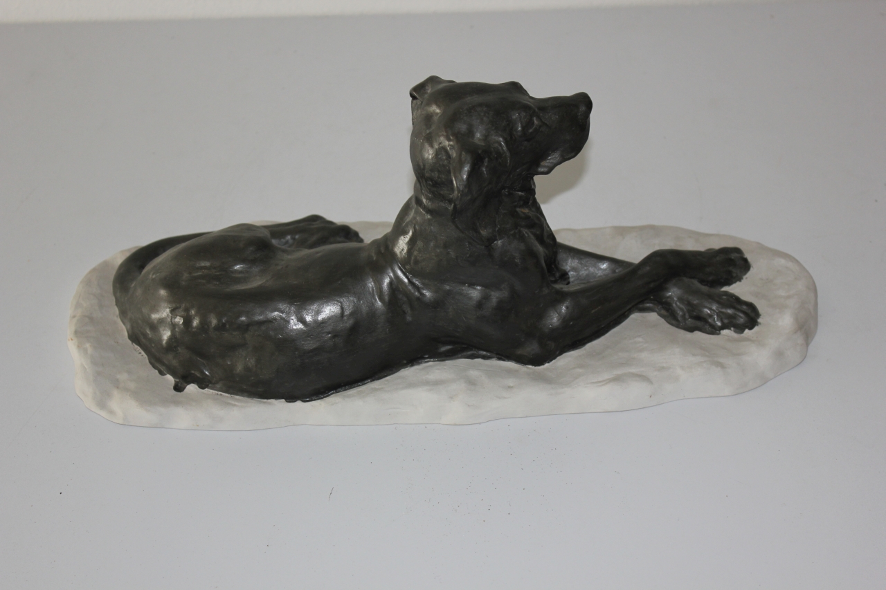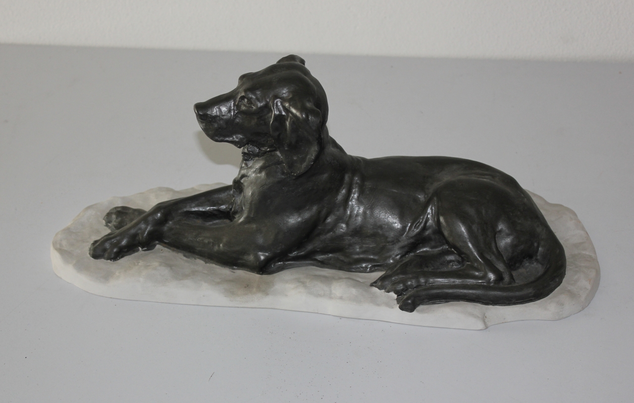Scultura in biscotto raffigurante un cane nero sdraiato. Base a finta terra in biscotto bianco