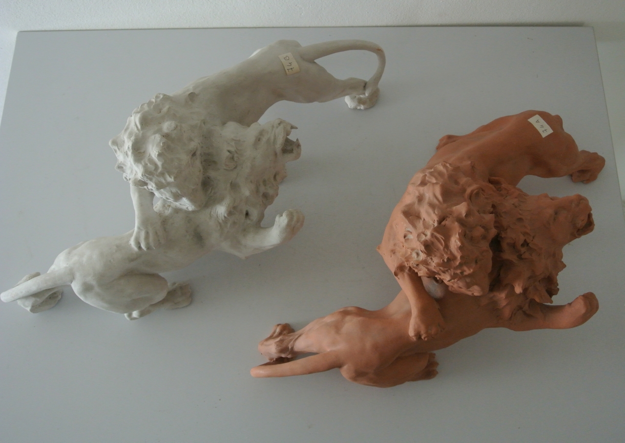 Coppia di sculture in biscotto ed in terracotta dipinta a tempera raffigurante una coppia di leoni in lotta. Il leone vincente azzanna il rivale sulla groppa e gli infligge una zampata sulla spina dorsale